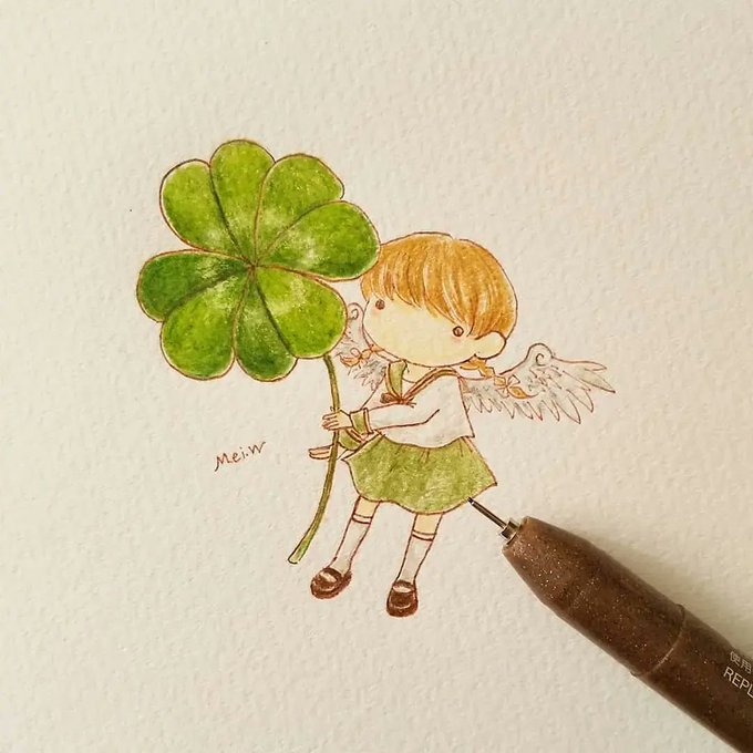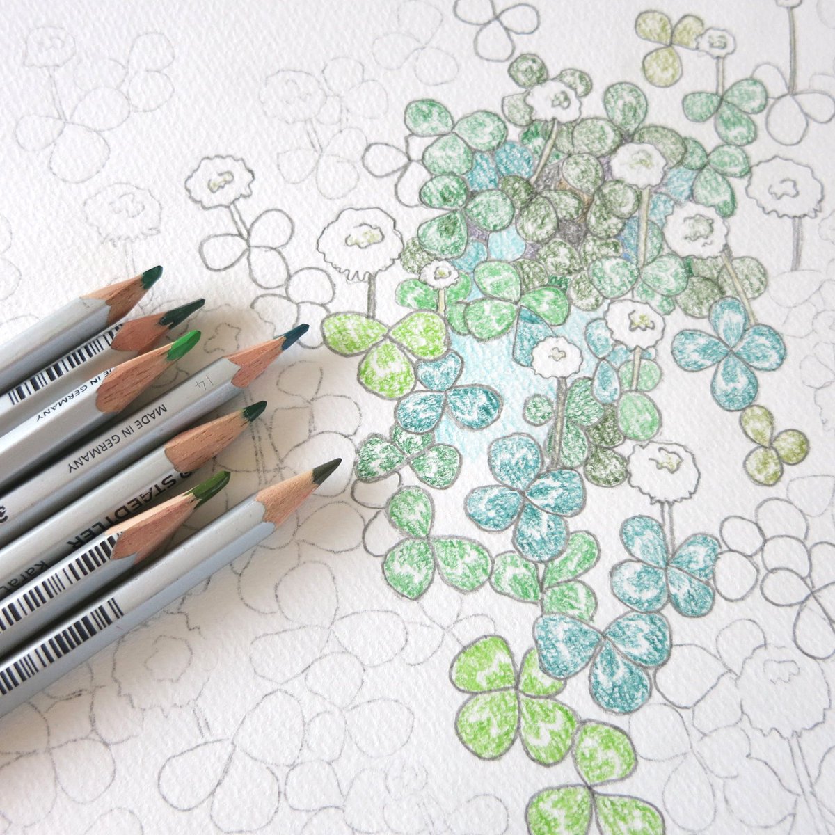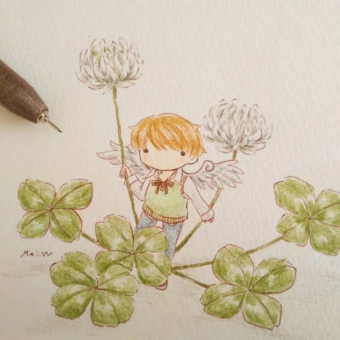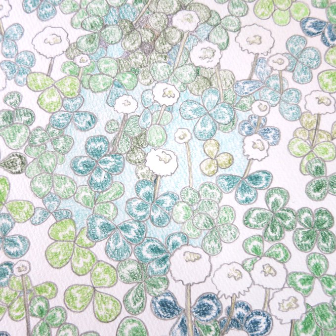 水彩色鉛筆で着色しました。まだまだ途中です。 #イラスト #みんなで楽しむTwitter展覧会 #初夏の創作クラスタフォロー祭り #絵描きさんとつながりたい #Pleasefollowme #art #芸術の輪 #ART_RT #美術ネットワーク #四つ葉 #クローバー