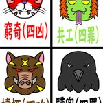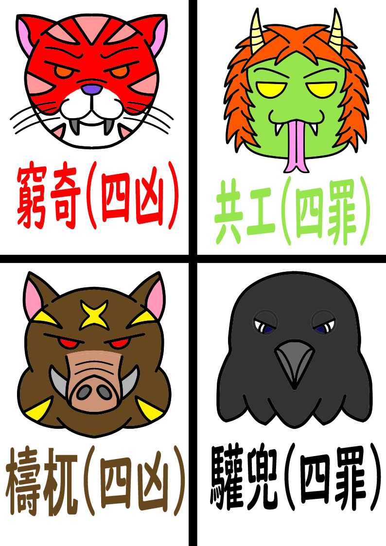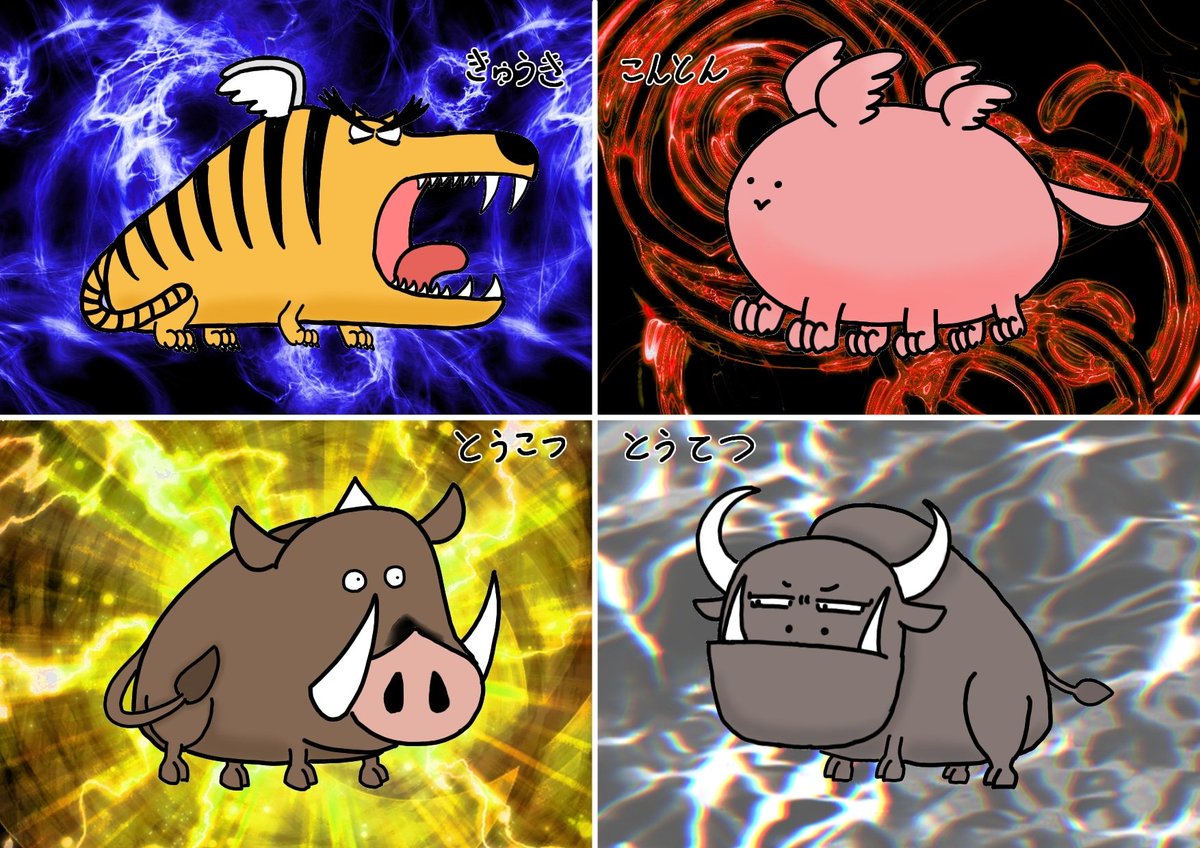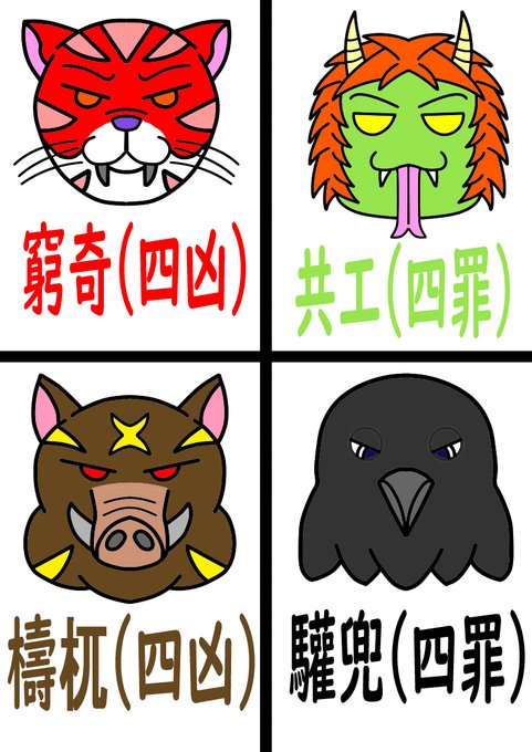 ポケモンSVの準伝説四災を見て、 中国の伝説の生物、四凶を描きました。 左上から窮奇(きゅうき)、渾敦(こんとん)、饕餮(とうてつ)、檮杌(とうこつ)です。 #イラスト好きな人と繋がりたい #絵描きさんと繋がりたい #アトリエの系譜 #デジタルイラスト #ibisPaint #幻獣 #四凶 #窮奇 #渾敦 #饕餮 #檮杌