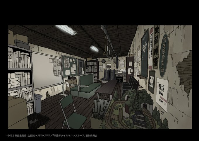 【#四畳半タイムマシンブルース】より、 「私」が住む、下鴨幽水荘209号室をご紹介! 前作 #四畳半神話大系 の時と家具の配置が違うのに気づきましたか?💭 何やら巨大な装置には前作にも登場したあの看板が…❗️👁 ぜひ劇場で私の部屋がどうなっているか確かめてみてください👀✨