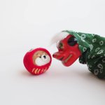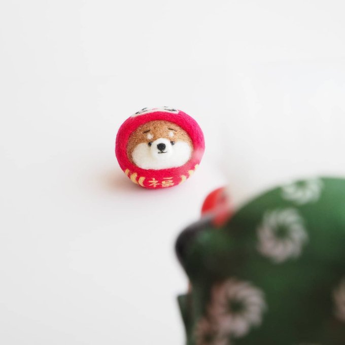 【柴犬だるまと獅子舞】 ①「あっししまいさん!」 · ②「ん?」 · ③「えっ近い近い💦」 · ④「わー!!」 · · つづく #羊毛フェルト #獅子舞 #柴犬 #だるま #犬好きさんと繋がりたい #ハンドメイド好きさんと繋がりたい #4コマ #困りまゆ