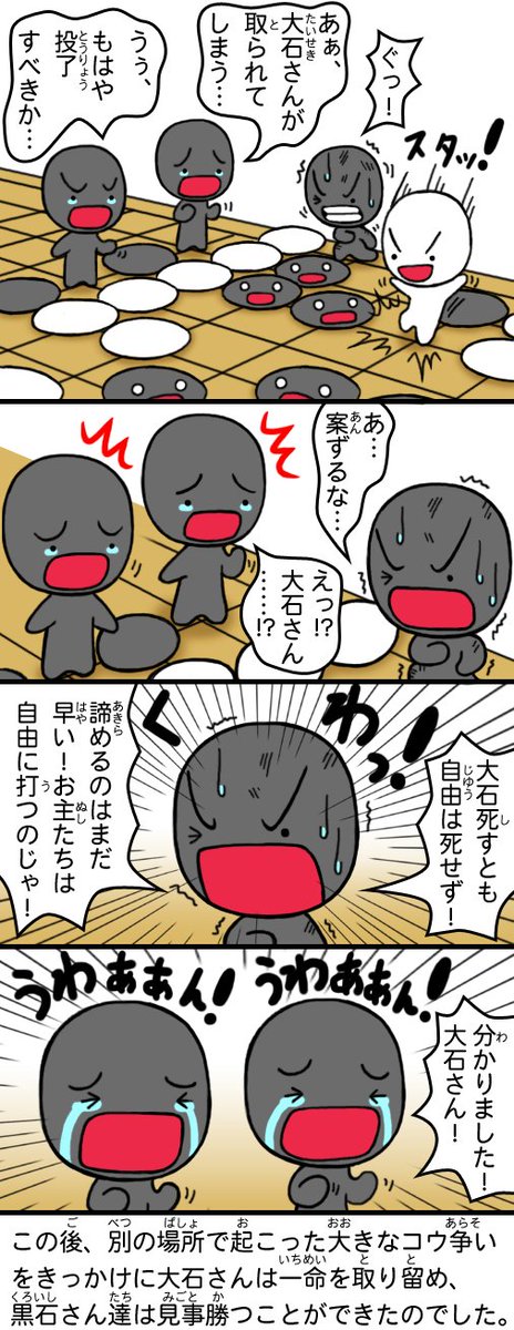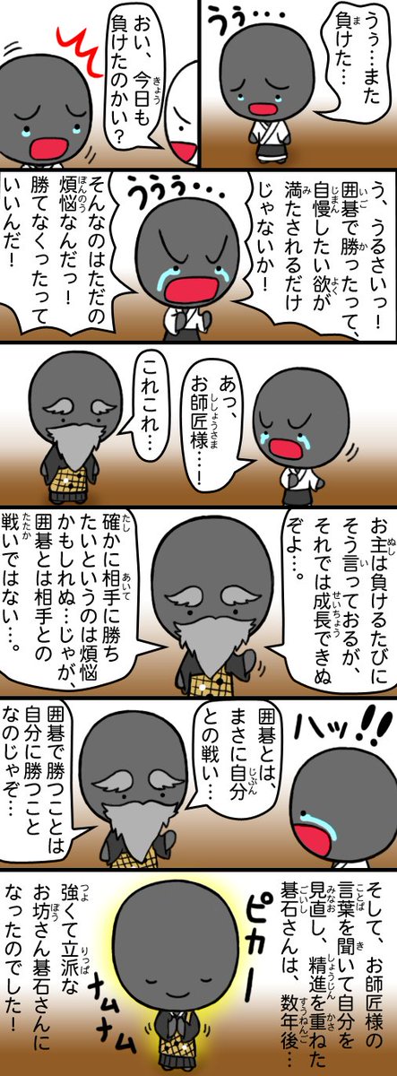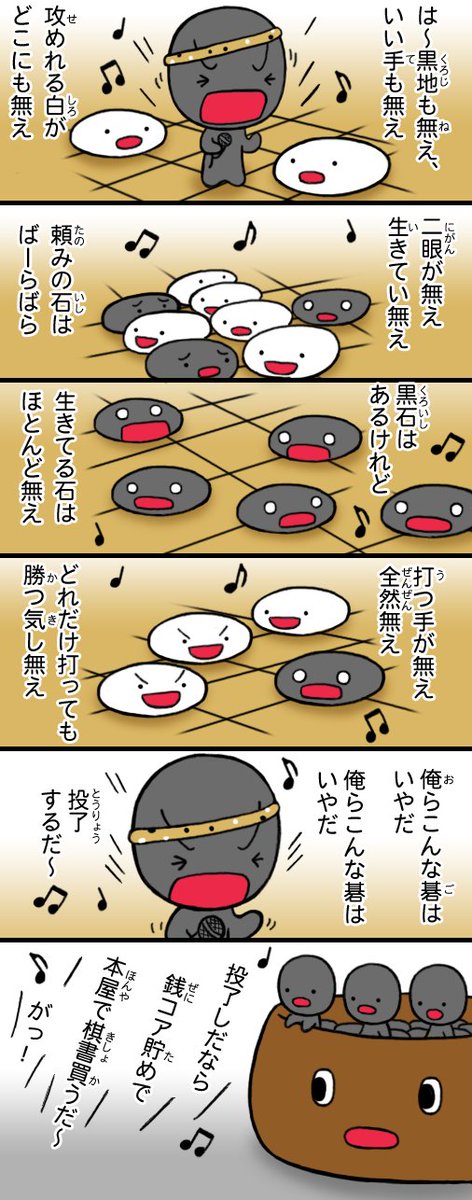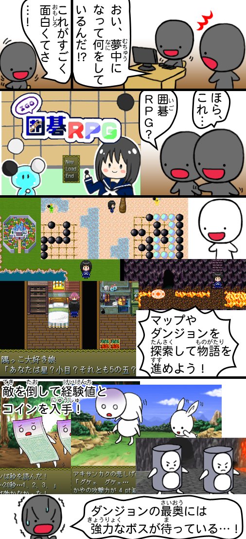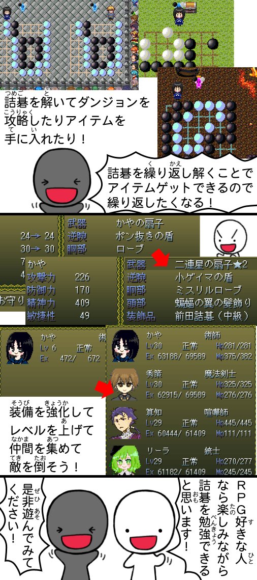 こちらのゲーム、すごく面白いので碁石さんでレビューっぽいのを描いてみました!(全2枚)。 敵キャライラストでちょこっと協力しています😄 ドラクエとかのRPG好きな人ならきっとはまると思うので、よかったらぜひ遊んでみていただければ😆 まだ開発版ですが、僕は結構やりこみました😆 #囲碁 twitter.com/akapemygo/stat…