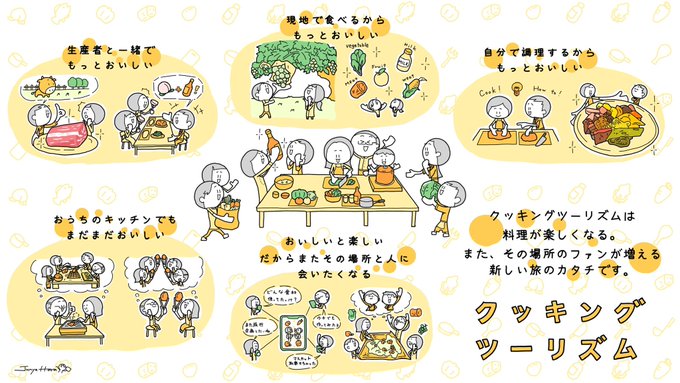 産地に旅行に行き、産地で出会い、産地でお料理する。 お料理を通じて産地とつながり、お家に帰っても産地にまた会える。 新しい旅とお料理のカタチ、クッキングツーリズムを図化させていただきました^ ^ #スケッチコミュニケーション #イラスト #図解