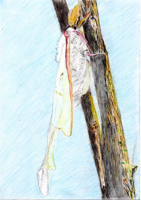 オオミズアオ。妻と植物公園に行こうかやめようか考えながら、結局天気の良い日曜日なのに家で絵を描いて過ごしたの巻。 #色鉛筆画 #萌え系かわいい系じゃないイラストが見たいタグ #国際生物多様性の日