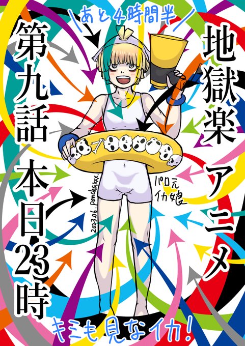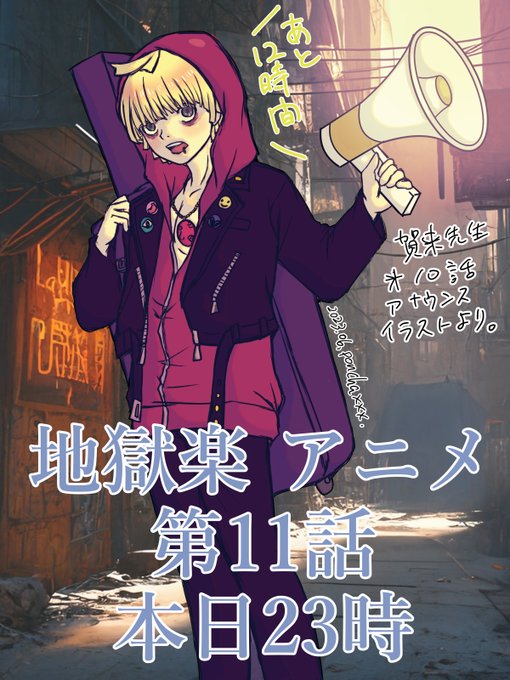 #地獄楽アニメ 勝手に応援アナウンスイラスト! 放送日に拡声器キャラを付知くんが真似っこ! 今週は迫力の主人公バトル回!君も地獄楽を見てみなイカ!個人的には推しがヒキに出るかに注目です。 #地獄楽ファンアート #付知