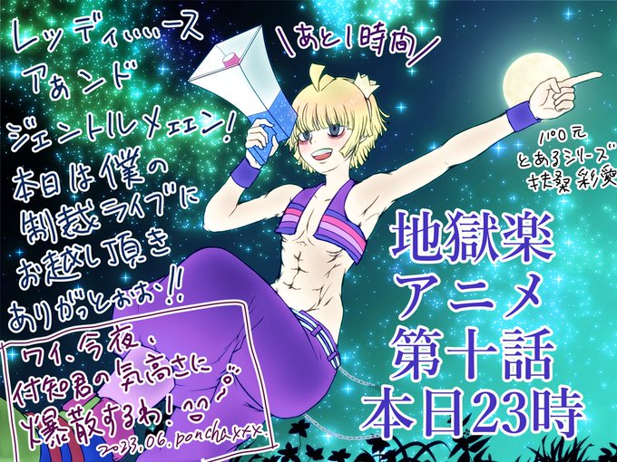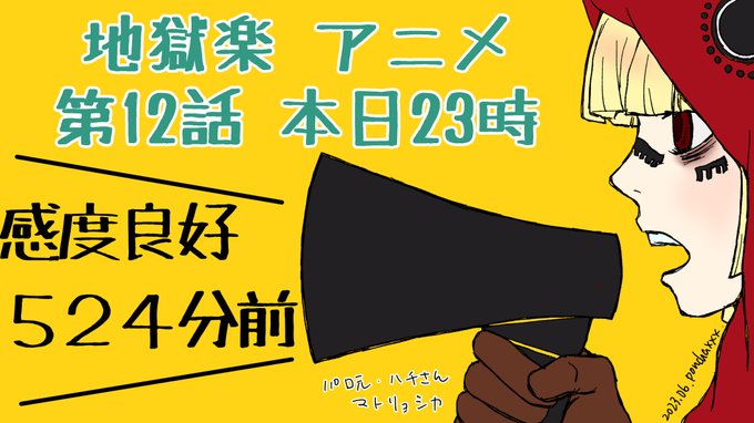 #地獄楽アニメ 勝手に応援アナウンスイラスト! 放送日に拡声器キャラを付知くんが真似っこ! 今週は7週間の時を経て、遂に再び付知んがしゃべる!もう今から興奮が止まらない!!しかしこういう日に限って予約操作ミスによる投稿の大遅刻をしてしまうというね… #地獄楽ファンアート #付知