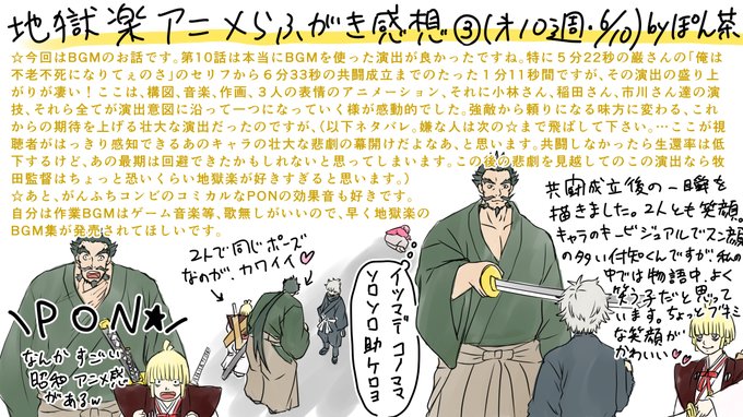 #地獄楽アニメ 第10話の感想絵その3です。 アニメ地獄楽のBGM、和風かつ勇壮でとても好きです💛作中BGMは和風テクノみがある曲もあって原作の賀来先生のスタイリッシュな画風にメッチャ合うなあって思っています。BGM集ほしいです(市川蒼さんのサイン入り台本もください🥹) #地獄楽ファンアート twitter.com/jplus_jigokura…