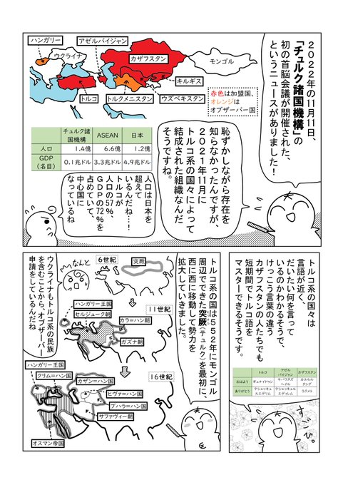11月12日 マンガできました! 今回は 「チュルク諸国機構!?」です!😄 こういう国際組織できてたの、知ってました? 自分は知りませんでした💦 ※ブログに補足・解説を載せています♪ syakaitteomosiroi.blogspot.com/2022/11/blog-p… #漫画 #漫画が読めるハッシュタグ #地理 #チュルク諸国機構 #トルコ