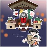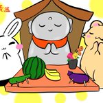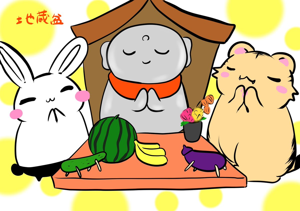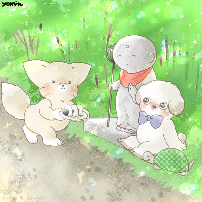 【ぷくりいぬ】7/24 #地蔵盆 おはよー☀️ 今日は地蔵盆!ぷくぷく町にあるお地蔵さんを労うよ 🦊🍙🍙🍙お待たせ〜 🐶🐢✨待ってました! 🦊💭自分たちが食べる気満々だな? #ゆるいイラスト #絵描きさんと繋がりたい