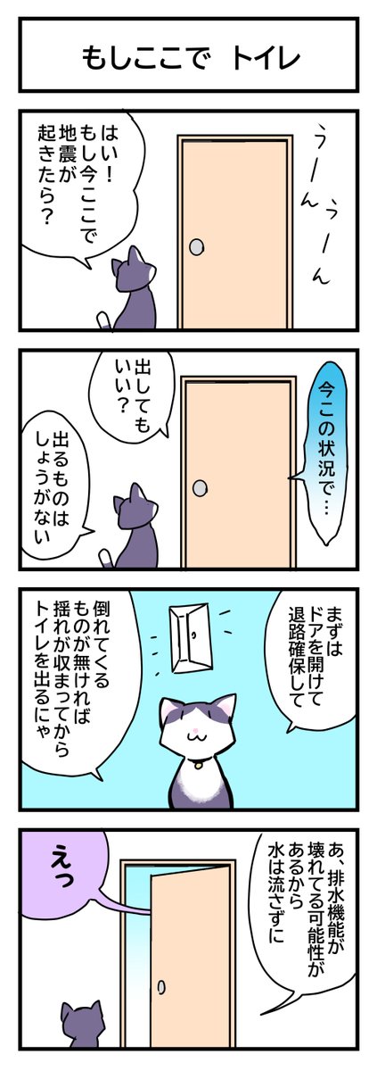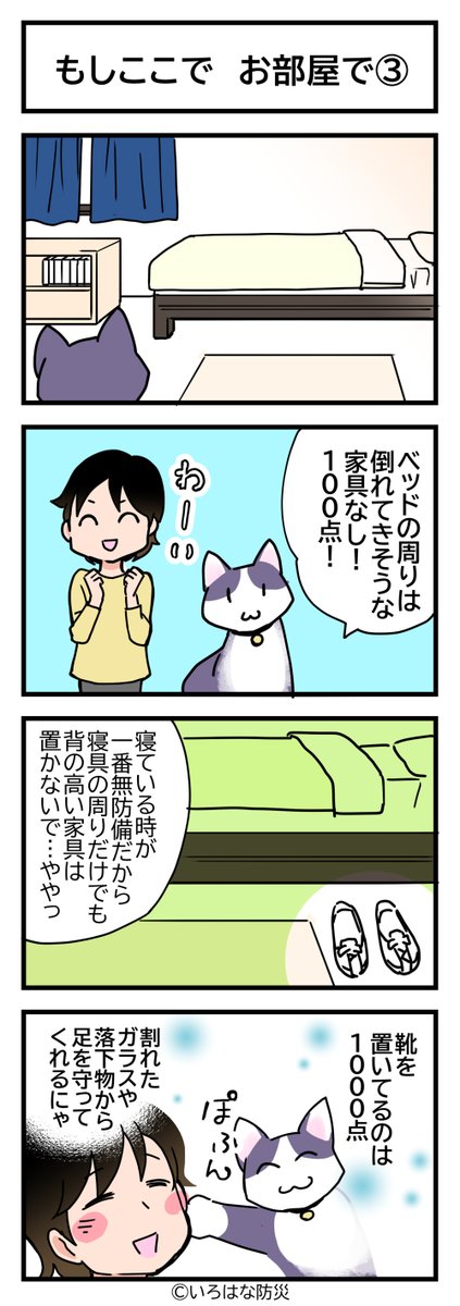 防災4コマ「もしここで」家具の固定を考える 地震にも、ねこにも有効。 #4コマ漫画 #防災マンガ #漫画が読めるハッシュタグ #いろはな防災 #地震 #家具固定 #猫漫画 irohana-bosai.com/manga/manga003…