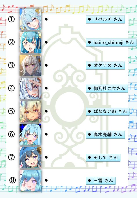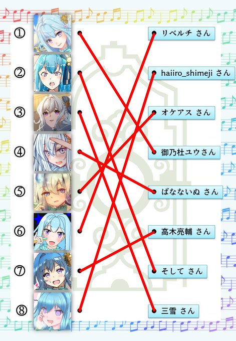 #城プロ版絵描き当て線結びクイズ リベルチ様(@liberty_suisya ) haiiro_shimeji様(@haiiro_shimeji ) オケアス様(@marina_oceas ) 御乃杜ユウ様(@minomori_yu ) ばなないぬ様(@1877inu ) 高木亮輔様(@ryousuke_takagi ) そして様(@So_shi_te_ ) 三雪様(@three_yuki )