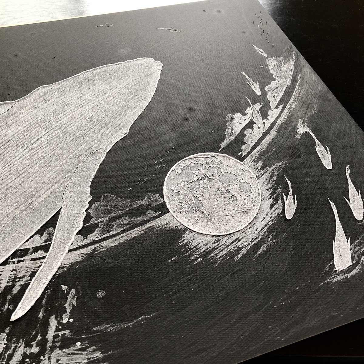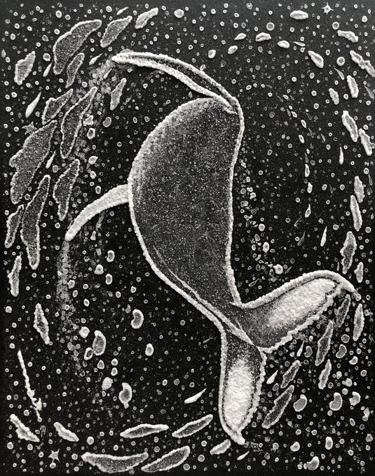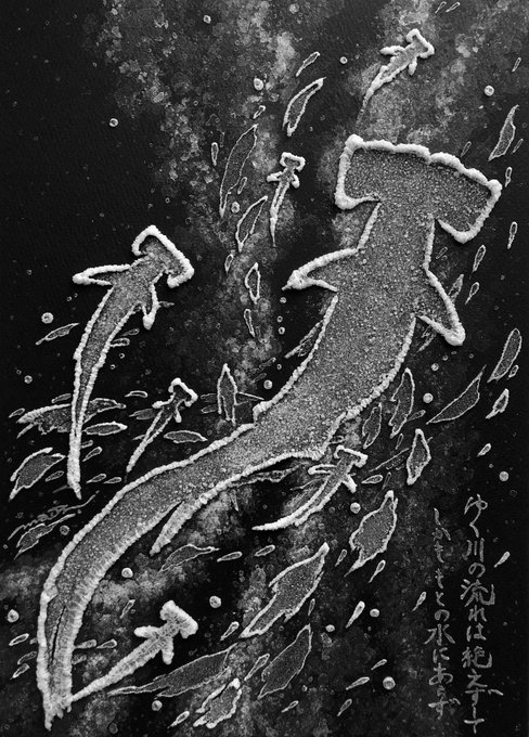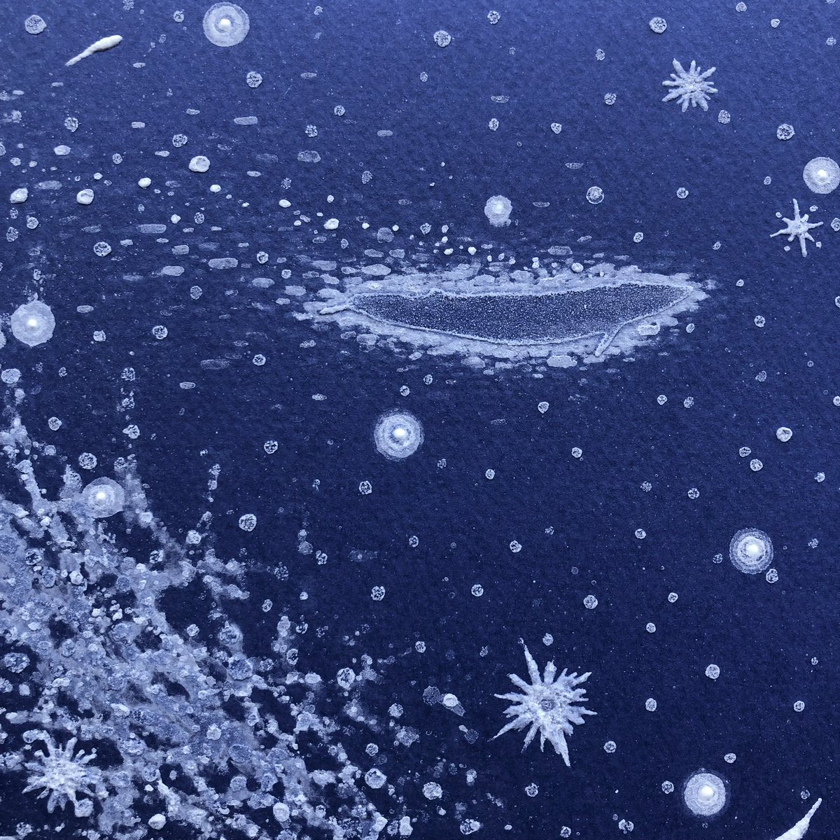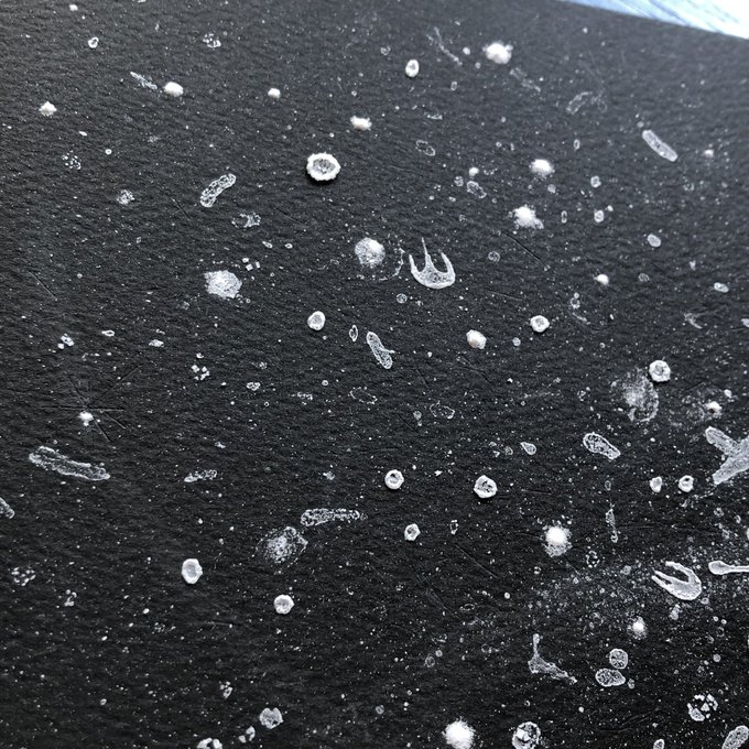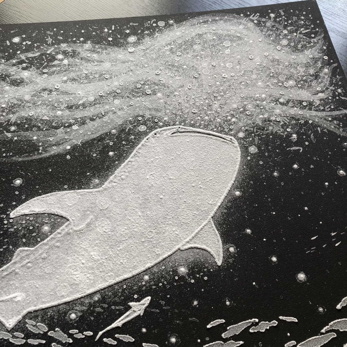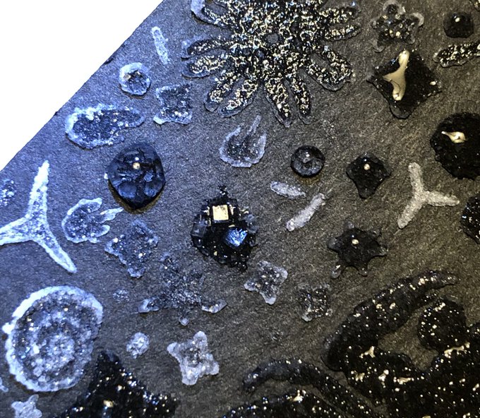 #何も言わず全人類みてくれ 位置決めしただけなので、一旦仕舞ってきましたが この塩水で描き作った塩の結晶作品(変化中)を観てほしい…! 2019年に制作した #塩水アート 作品なのですが お分かりいただけるだろうか… 勝手に塩が鮫肌の如く仕上がったのは我ながらびっくりした🦈未だ健在です↓
