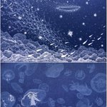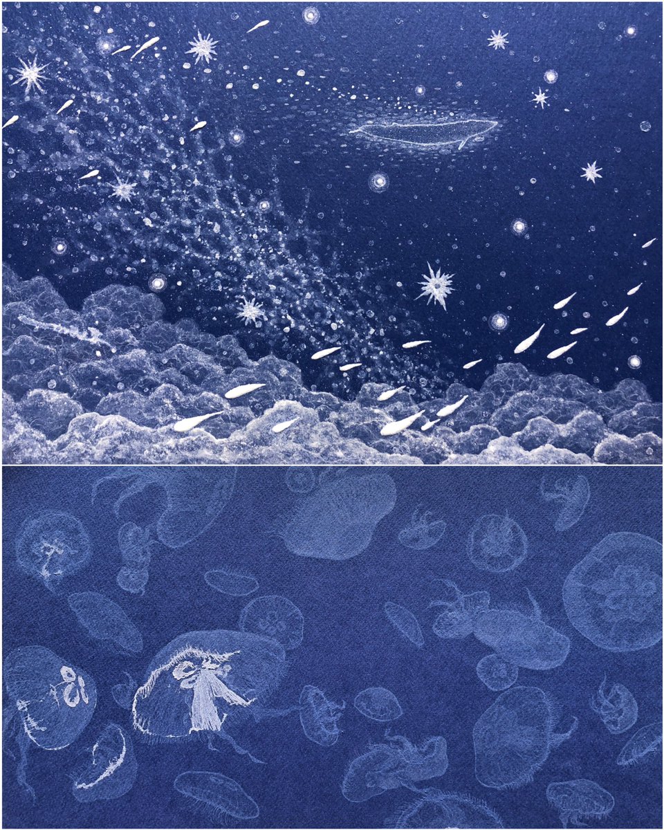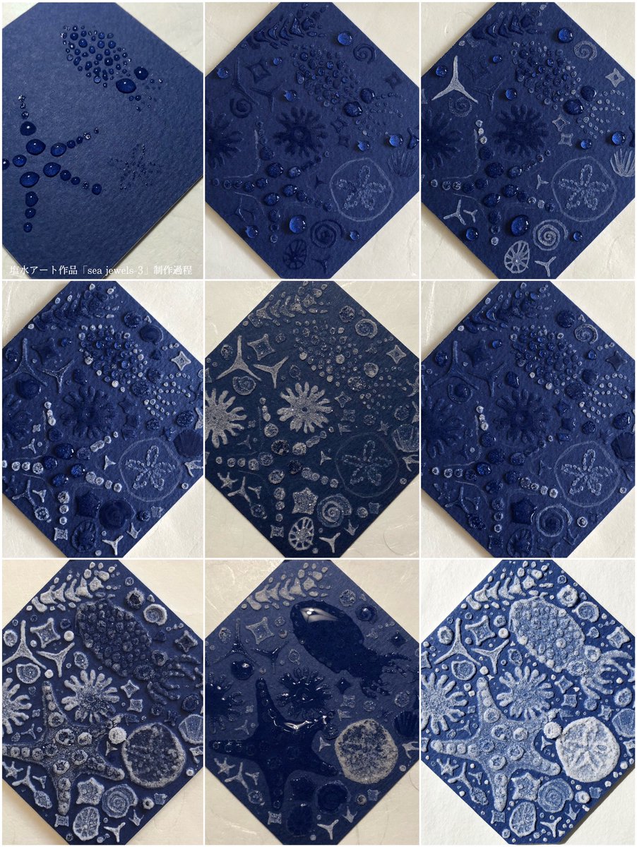 #ゴールデンウィークSNS展覧会2023 塩水を再結晶化させて作る💎 #塩水アート 青の世界編 下のミズクラゲの作品は制作したての姿ではなく、死を迎えるとき身体が海に溶けていく本物のクラゲたちのように 空気中の水分によって年単位で少しずつ、還っている途中の姿です