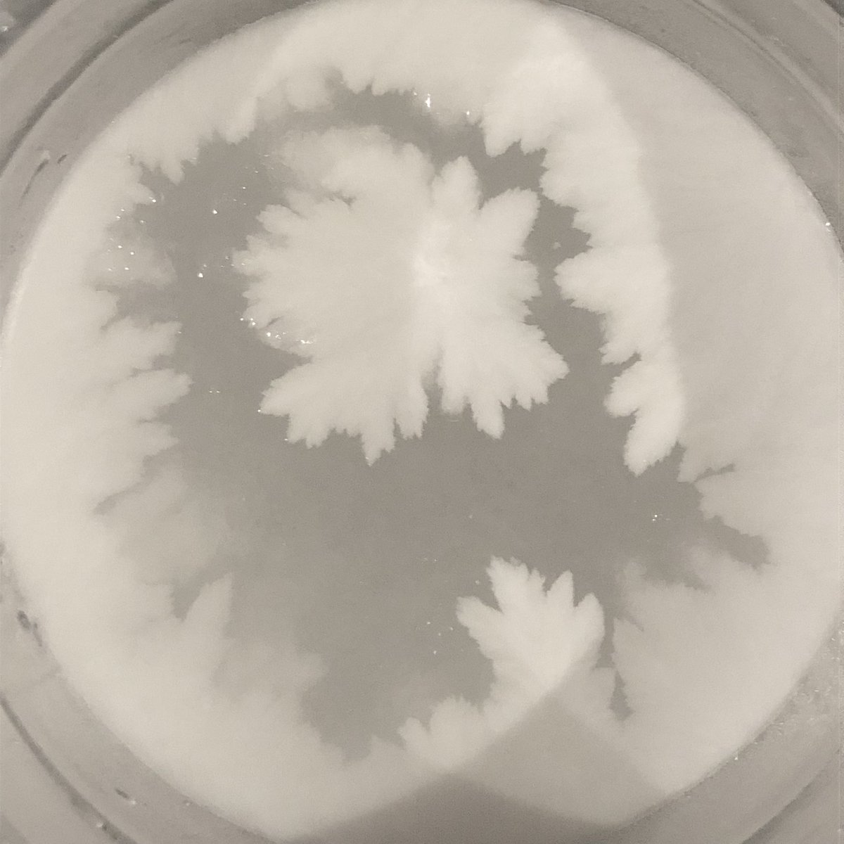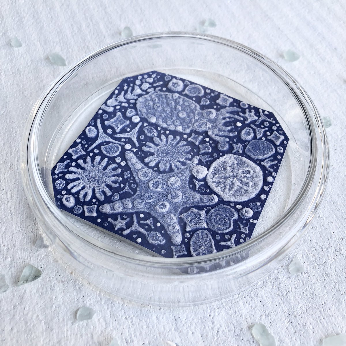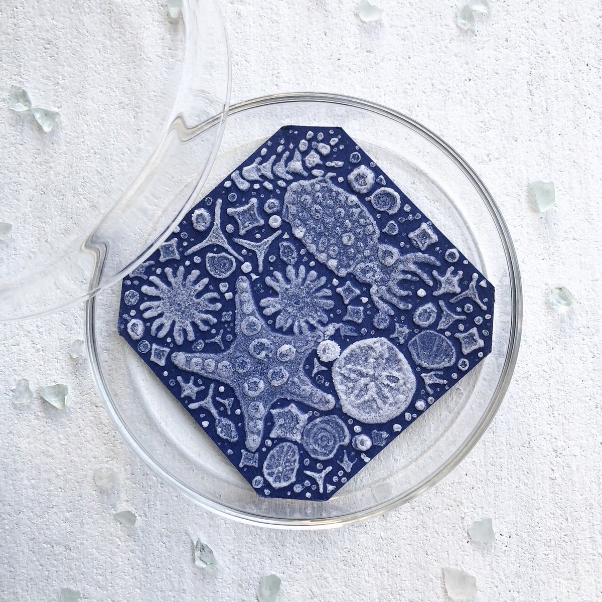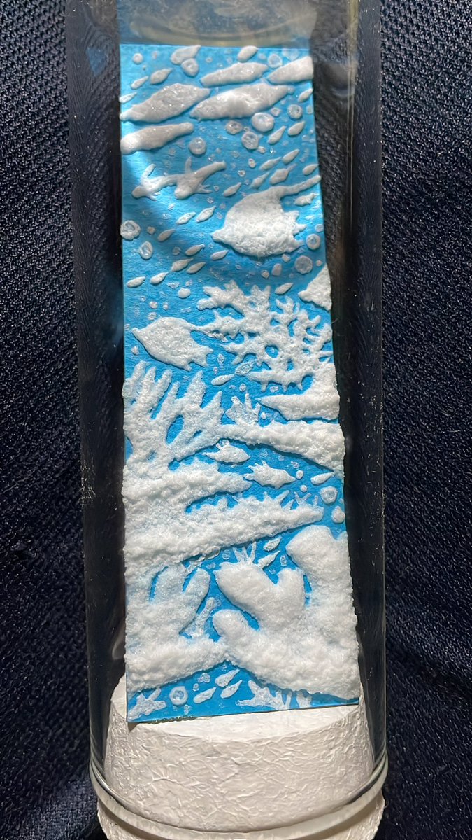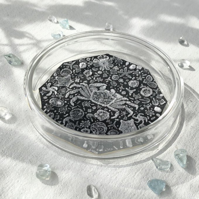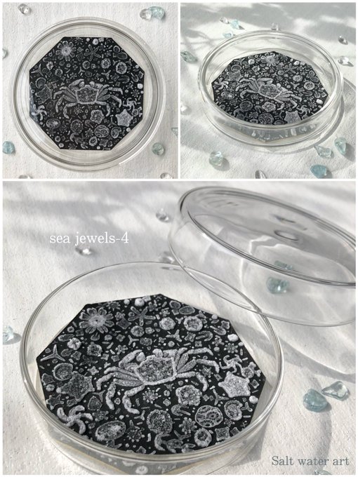 ↑この制作過程、擬態(色素細胞の変化)のようではありませんか?笑 実際は結晶を育てているのでアオリイカエケチェン出現まではとても時間かかってますが…笑 #塩水アート なのでこれからの変化も擬態の如くなる予想です💎 シャーレに採取したのがこちら🤲 〜11/29まで掲載中lashima.thebase.in