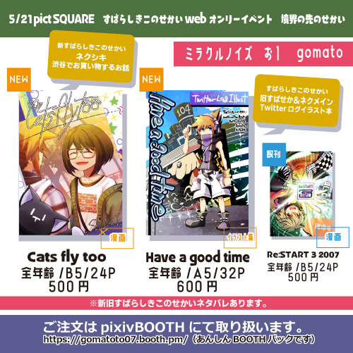 5/21sbskwebオンリー『境界の先のせかい』 スペース番号【お1】ミラクルノイズ(名前はgomatoです)のお品書きとサンプルです(最後はサクカ)よろしくお願いします~。 pixivにてサンプルのさらに詳細があります↓ pixiv.net/artworks/10778… #境せか参加者