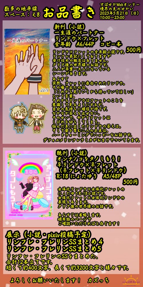 #境せか参加者 お品書きです! ※抜けている部分が多かったので修正して再掲します 新刊サンプル↓ kazutti-amatihe.booth.pm/items/4756982 既刊サンプル↓ kazutti-amatihe.booth.pm/items/3918360 サークルカットも載せます。 当日はよろしくお願いいたします!