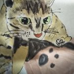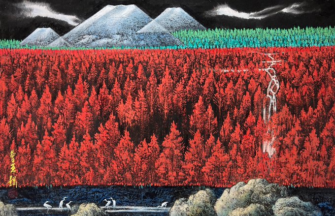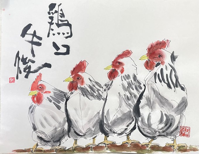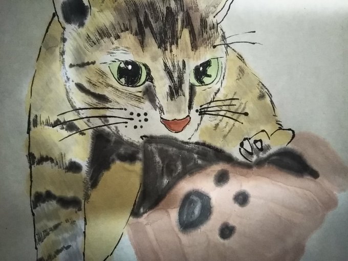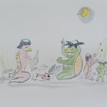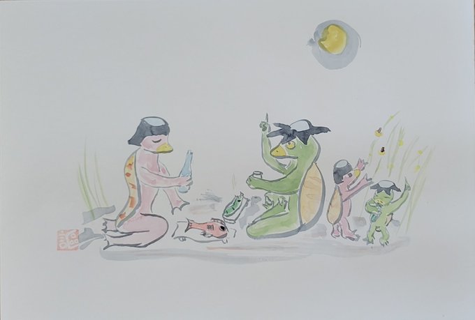 『団らん』 おはようございます☁ 今日はジメジメムシムシですが、 熱中症対策して 水分補給忘れずに🚰 河童見て少しも涼んでね🥒 皆さん今日も素敵な一日を🍀 #絵描きさんと繫がりたい #絵描きさんフォロバ100 #みんなで楽しむTwitter展覧会 #芸術同盟 #墨絵 #顔彩 #墨彩画 #河童