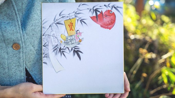 十日えびすの福笹を色紙に描きました。 ⛵️「順風満帆」 えべっさん、今年もどうぞよろしくお願いいたします🙏 #イラスト #イラスト好きと繋がりたい #絵柄好みって人にフォローされたい #墨彩画 #水墨画