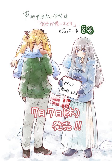 毎日暑い日が続いておりますが、皆様どうお過ごしでしょうか。 声カノ単行本8巻が7月7日(木)に発売します。羨ましい涼しい表紙が目印です☃️❄️ よろしくお願いいたします🌸 #声がだせない少女は彼女が優しすぎると思っている