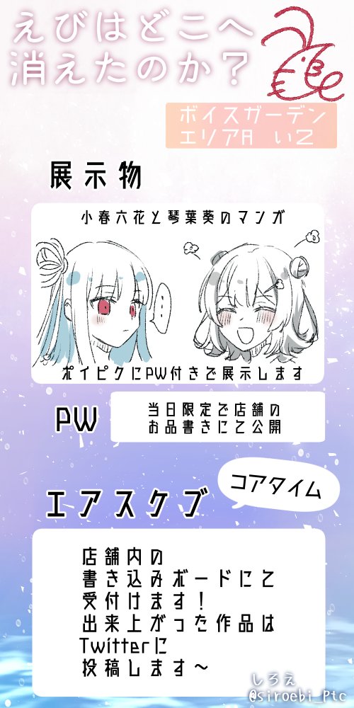 明日開催、ボイスガーデンのサクカ用意しました~ エリアA い2 になります #声庭 小春六花と琴葉葵の漫画をPW付ポイピクで展示予定です。 当日イベント会場内のお品書きにパスワード書きます。 あとコアタイムでエアスケブ予定です。 よろしくお願いします!🦐 twitter.com/siroebi_ptc/st…