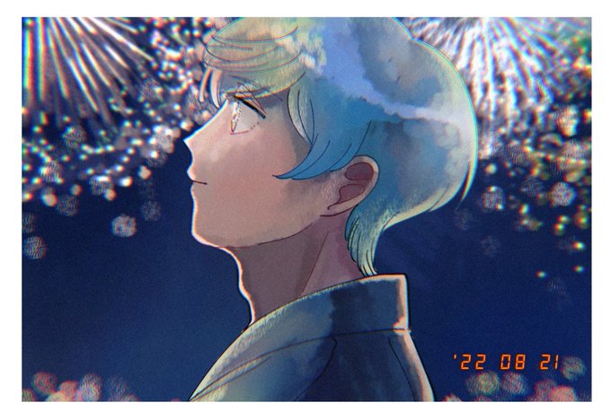 PM7:00 祭りの締めくくりの花火が始まりました。 鮮やかな光の華が夜空を明るく彩ります。 一期が言葉もなく花火を見上げていると、鶴丸がそっと顔を近づけてきました。 楽しかった逢瀬も、もうすぐ終わりを迎えます。 #夏のつるいちアルバム