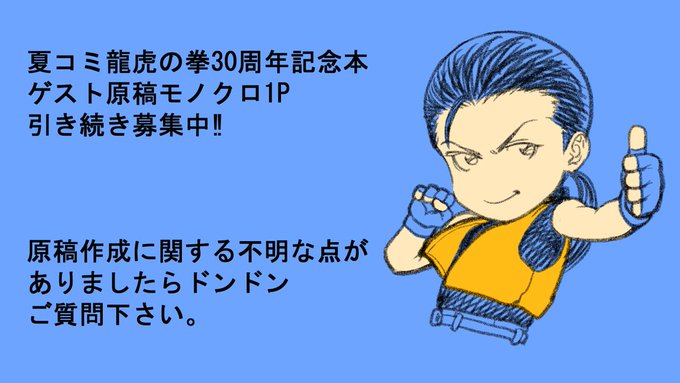 【お知らせ】 入稿も無事済み何とか #夏コミ龍虎の拳30周年記念本 出せそうです。今回は30周年記念なのでTwitterで募集させて頂いたゲストの方々7名による1P原稿も載っております。今回は通販も予定してます。