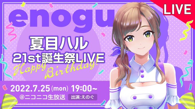 🎂夏目ハル誕生祭ライブ開催🎉 夏目ハル21歳の誕生日を記念して『誕生祭ライブ』が決定🎤✨ 『#夏目ハル21st誕生祭ライブ 』 開催:7月25日(月)19:00 会場:渋谷GRIT ※無観客配信ライブ 配信:ニコニコ生放送(URL近日公開) 出演:えのぐ みんなで楽しく盛り上がりましょう!お待ちしてます(*´꒳`*)