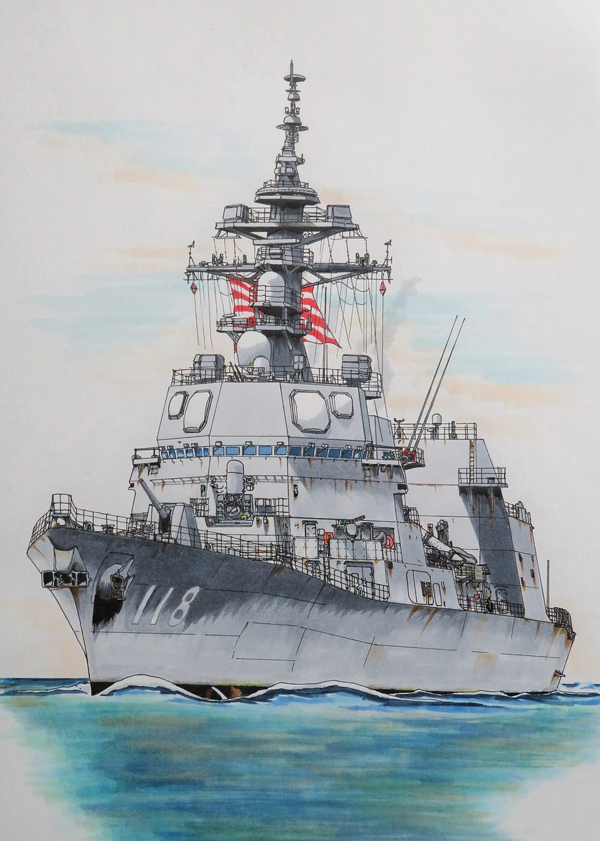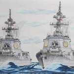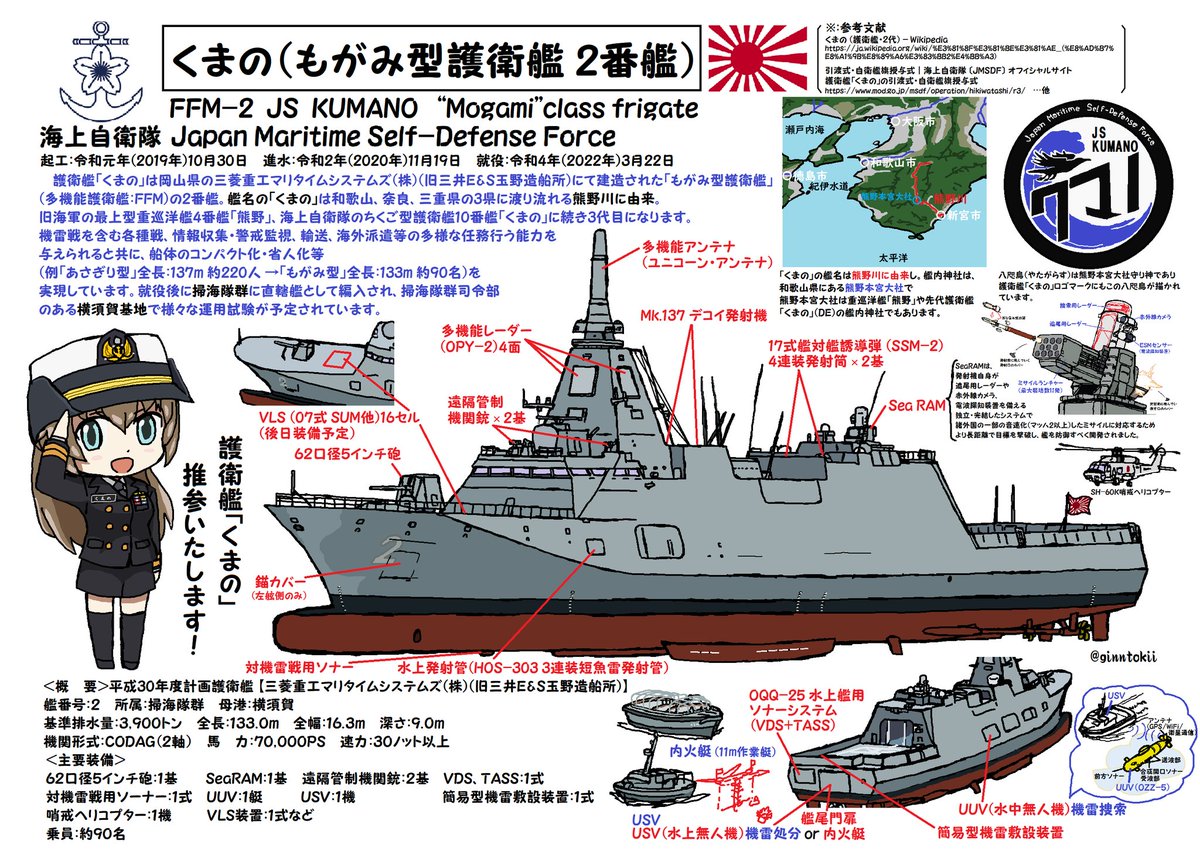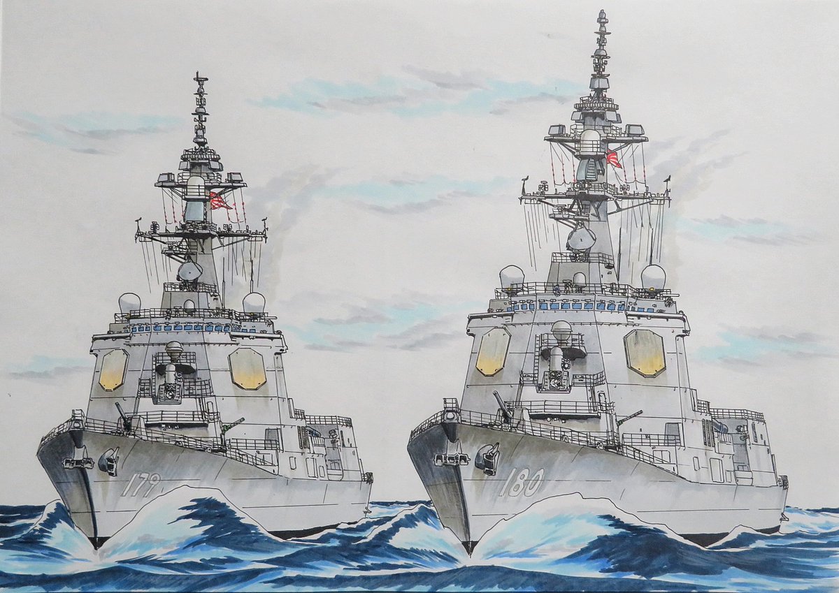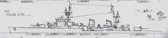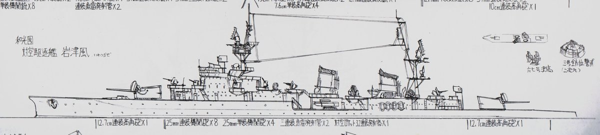 #架空艦 #イラスト #Wakou_Koku #夏祭り観艦式2022 和光國海軍(Wakou-koku Navy)[WN]より 名称 岩津風(いわつかぜ) 対空駆逐艦 主砲 12.7cm連装高角砲 2基 機砲 25mm連装機関砲 8基 機砲 25mm単装機関砲 4基 噴進 対空ロケット32連装発射器 1基 水雷 三連装魚雷発射管 2基