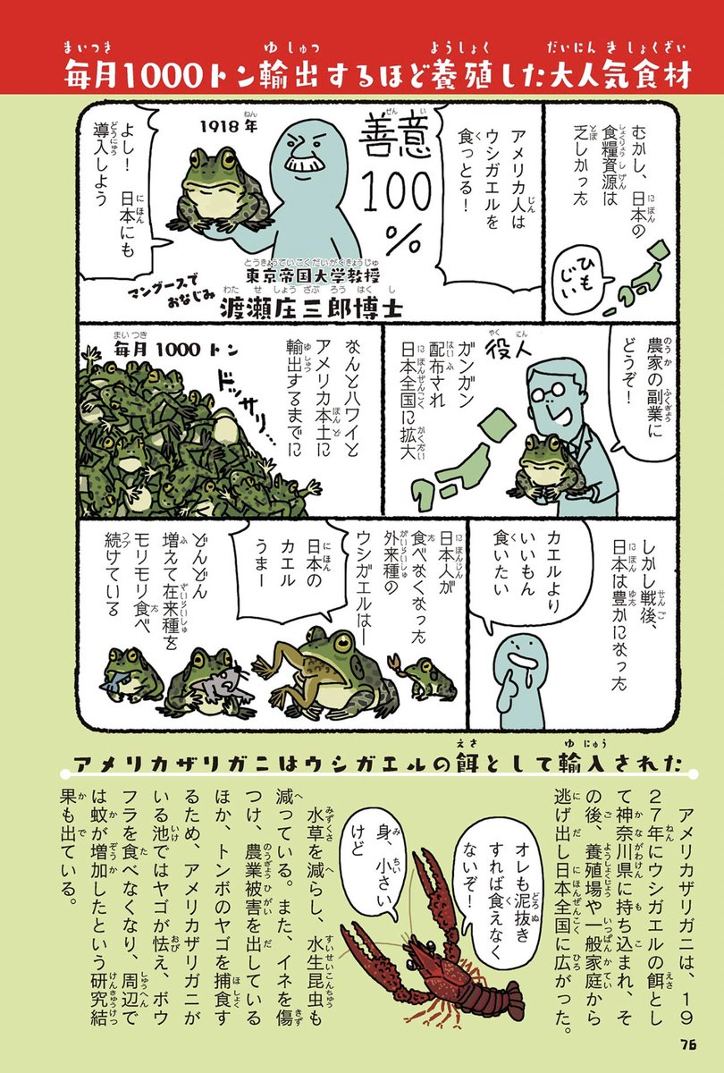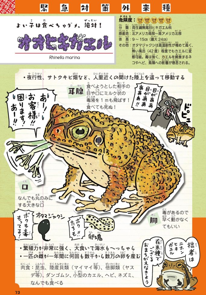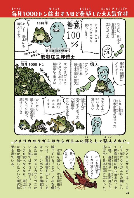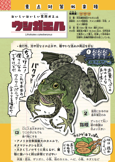 @MasamiT 宣伝になってしまいますが、🦞アメリカザリガニ導入のきっかけとなった🐸ウシガエルについては、拙著『侵略!#外来いきもの図鑑 もてあそばれた者たちの逆襲』(amzn.to/3jnLf8V)で漫画とイラストつきで紹介しておりますので、ご一読いただけると幸いです。