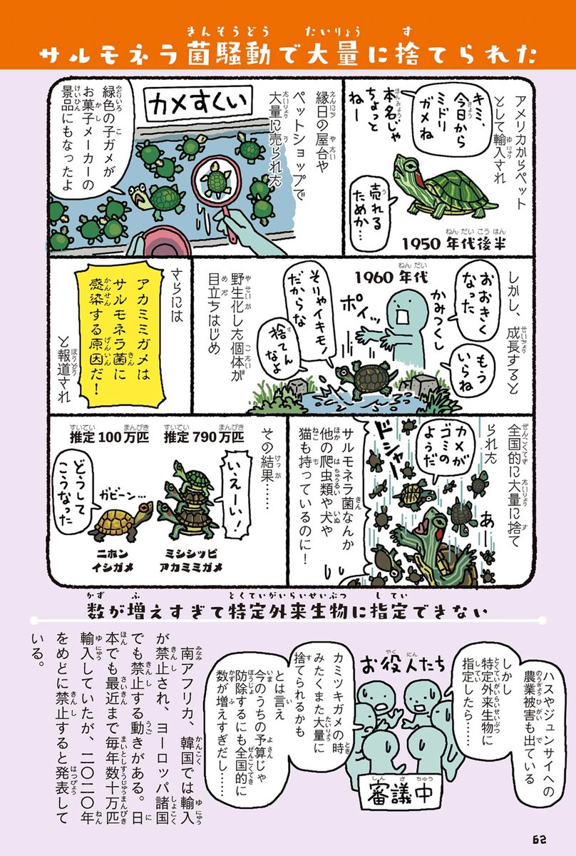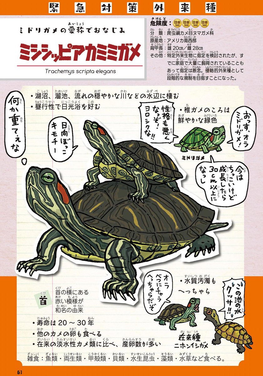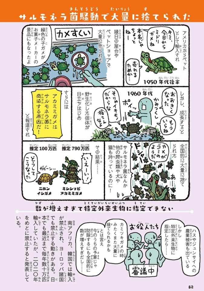 『侵略!#外来いきもの図鑑 もてあそばれた者たちの逆襲』 (amzn.to/3jnLf8V) 📚本を読む気力すらない時でも読める漫画とイラストだらけの本。外来種導入・侵入の経緯・歴史・影響に興味がある方は是非。大人も子供も楽しめる総ルビです。本屋さんでは児童書の棚に置いてあります。