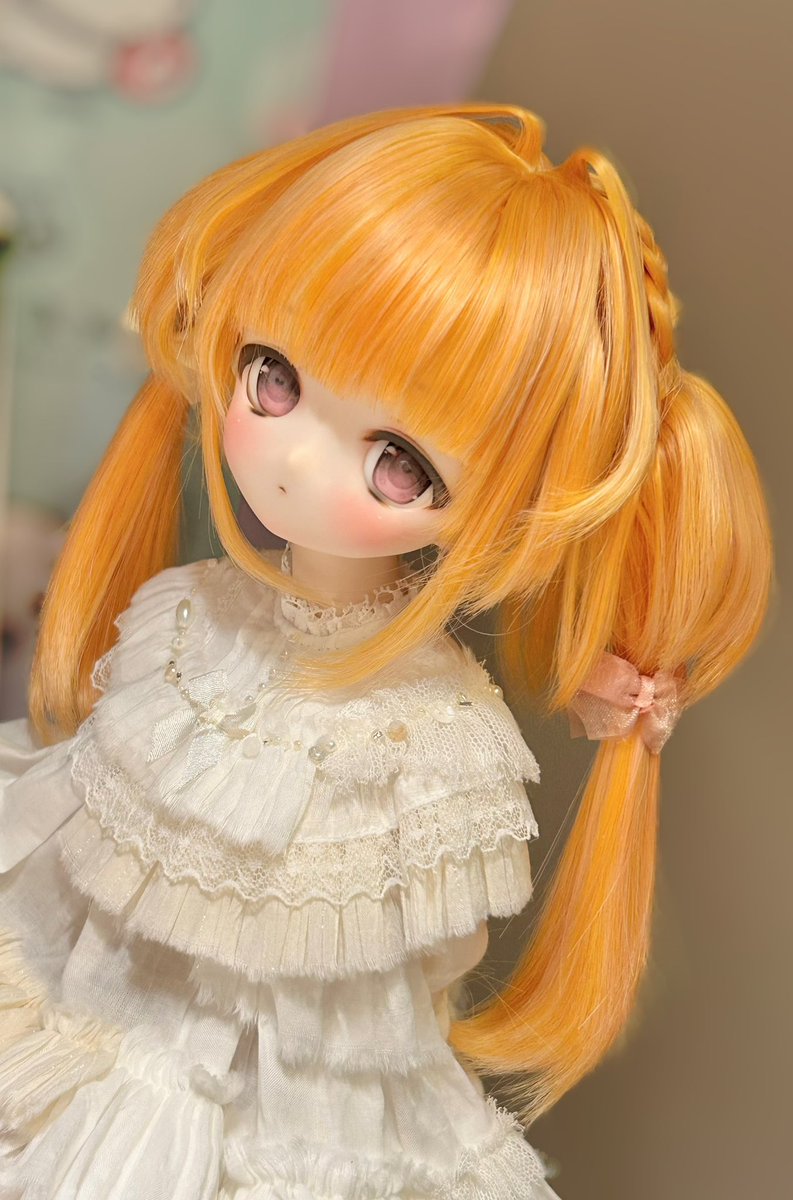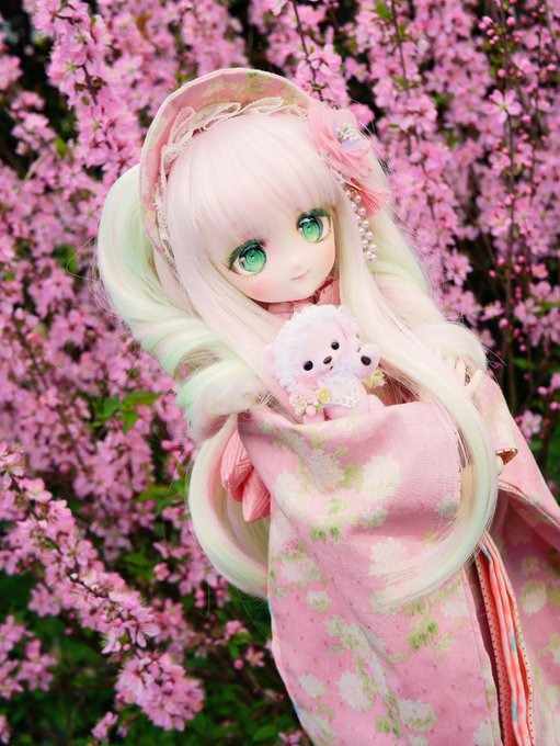 #nar_noir_doll 様よりお迎えした22番ちゃん🌸桜餅みたいなとっても可愛い子です😍 キラキラ若葉色のアイメイクに艶ぷるなリップ、細部まで美しすぎます✨ 💎エメラルドのアイ→#夜アイ 様 👘華やかなお着物→#お華着 様 🌸サクラピンクなウィッグ→#mimiel_doll 様 #MDDはいいぞ #はちす百花