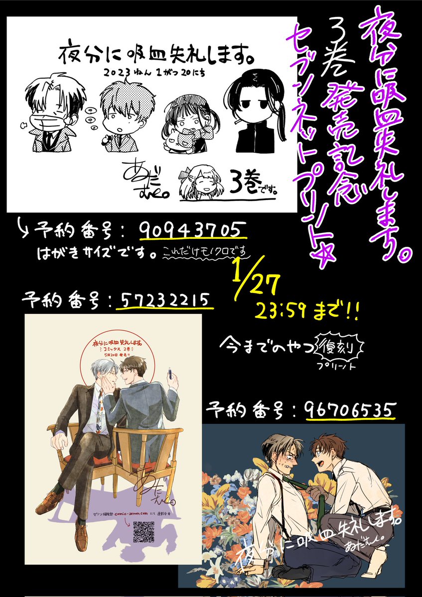 お知らせ📢夜分に吸血失礼します。3巻発売日となりました🎉入荷が遅れる地域もありますがお見かけの際はよろしくお願いいたします✨発売記念にセブンネットプリントを登録しました!1月27日までです⭐ご感想もどんどん呟いて頂けたら嬉しいです😺✨ #夜分に吸血失礼します。 twitter.com/higemoku/statu…