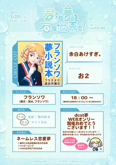 【イベント開催のお知らせ】 2023年3月19日(日)dcst夢WEBオンリー「君との夢を石の世界で!」をpictSQUAREにて開催いたします! 概要を特設HPにまとめております、皆様是非奮ってご参加ください! 特設HP dreaminsw.com pictSQUARE onl.tw/X5UXqd6 #dcst夢 #dcstプラス #夢の石世界