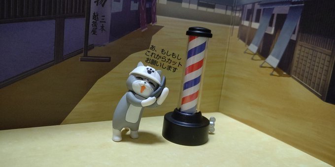 夢幻堂さんとこはちゃんとした 美容室なので、ちょんまげになることはありません。 パロディーです。 #オモ写 #楽しく玩具撮影会 #仕事猫 #トイズキャビン #夢幻堂 #バーバーポールゼンマイマスコット twitter.com/kira_kura/st…