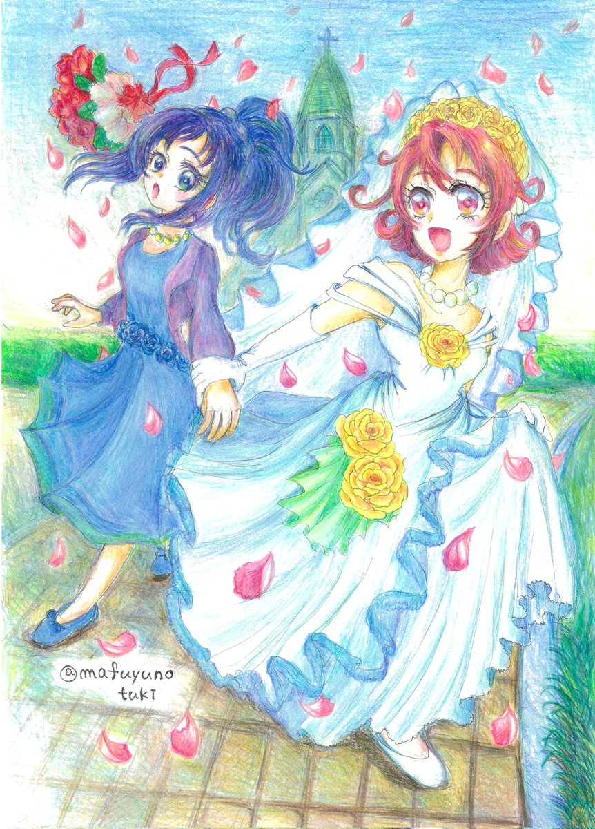 #大人プリキュア アンソロジーに寄稿したイラストです 約10年後のMIYSTIC DIVA(黒川エレン・剣崎真琴)がアコースティックスタイルでライブハウスツアーやってるといいなーーーという twitter.com/SHIN_YANAI/sta…