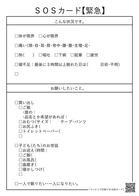(※再掲だよ~) #コンビニで印刷できる絵カード #A4サイズのイラスト ※写真は #大人用SOSカード です ユーザー番号:7WYBAG3DPM ボランティアで絵カードなどの視覚支援グッズを作っています。 コンビニの印刷代だけご了承くださいませ。 bit.ly/2HnTNxr