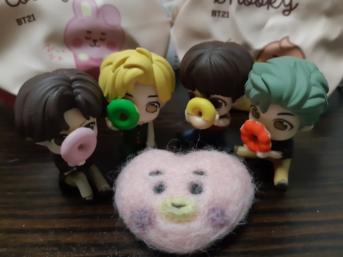 ぜーったいに無いと思って行ったガチャコーナー。やっぱり殻だったけどスタッフさんに聞いてみたら在庫ありますよって補充してくれて💜そして、居合わせたアミさん達と交換しながら4人揃いました😊 そして、またチクチクTATAを作ってます😁 #BTSARMY #大人ARMYさんと繋がりたい #羊毛フェルト