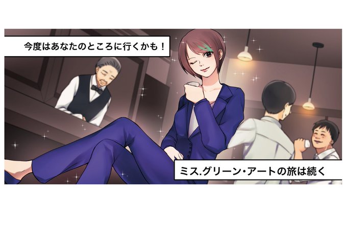 今回のお話はこれでおしまい、どうだったかしら? 素晴らしい会社と社員さんたちだったわね。これからも私は困っている方をシュッと導くわ。 今後の活躍から目を離しちゃだめよ。 #大団円 #だいえんだんは読み間違え #イラスト #マンガ #ミスグリーンアート
