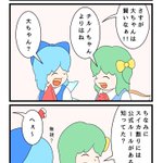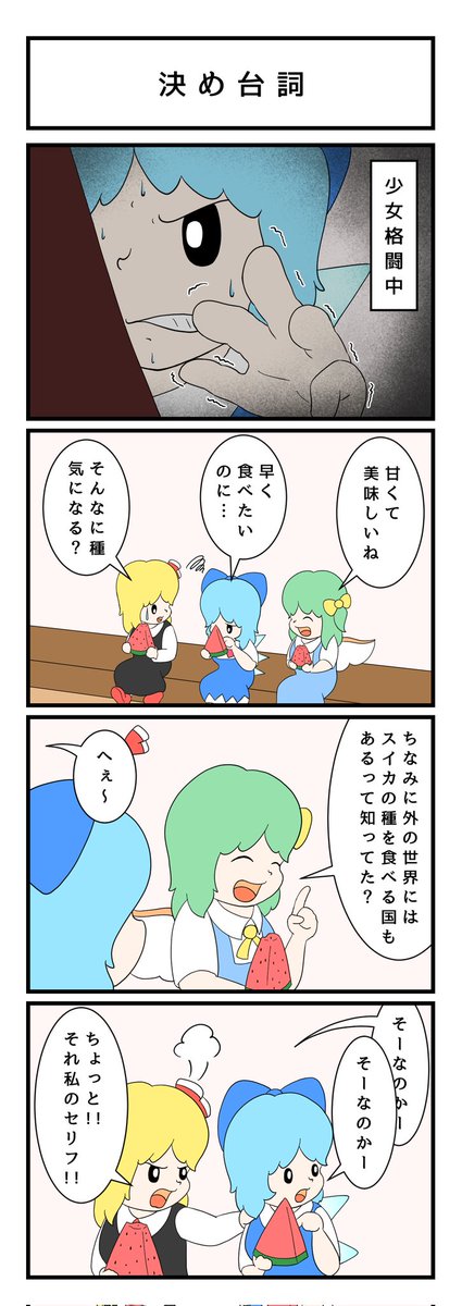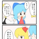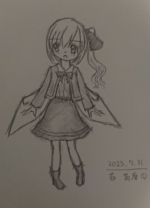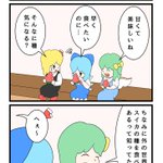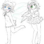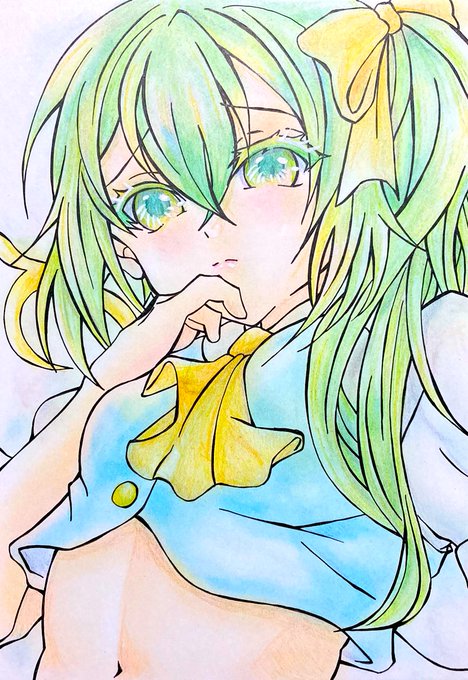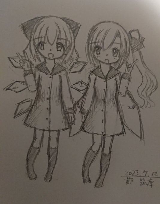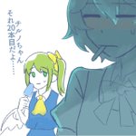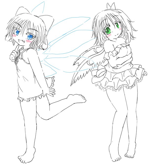 ダグ>(´・ω・`) ( ・ω・)<マルカイダ! 刀剣の鉄人面白いわぁ〜 そんなこんなしながら描いてたチルノと大妖精。両方とも服装変えてみた。チルノは元気なイメージがとても強いんでパンツスタイルに。 #絵描きさんと繋がりたい #チルノ #大妖精