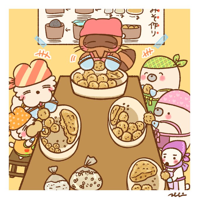 今日は #大寒 ですね。一年で1番寒い時期ですが、大寒に味噌を作るのが良いそうですよ🌟 そこでインちゃんときんちゃん達は、駄菓子屋さんのおばあちゃんからお味噌作りを教えてもらいました♪ おいしくてあったか〜いお味噌汁が食べれる日が待ち遠しいなぁ♪ #イラスト #わふわふみゃふみゃふ