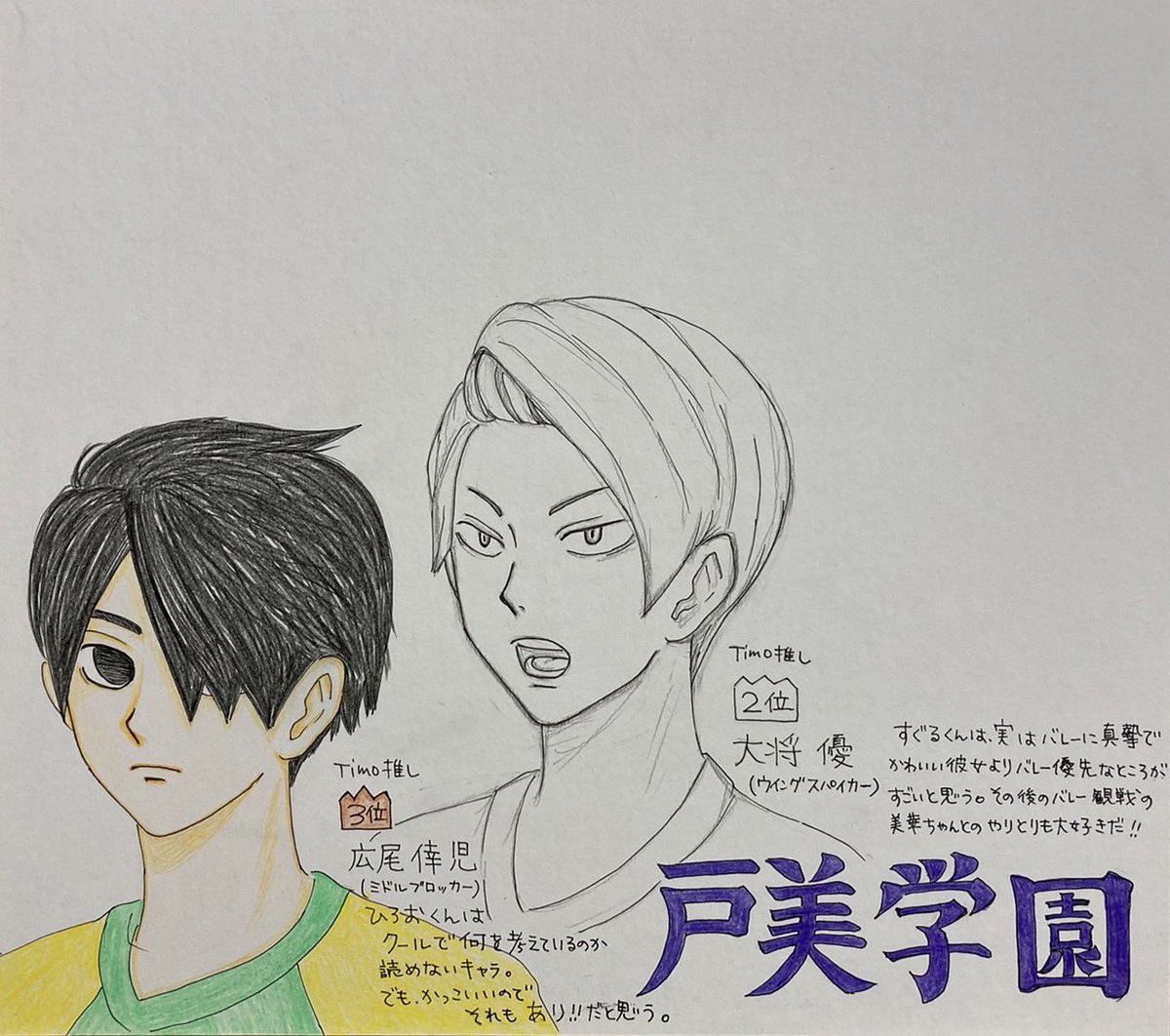 ハイキュー10周年、キービジュアル風! 捏造シリーズ7人目は… 戸美学園出身の大将優くん✨🏐🐍 所属チームの「ヨツヤモータースピリッツ」のユニフォームが不明なので、青色で描いてみました❣️ 彼女のミカちゃんは看護師さんですね😍10年愛素晴らしい👏😍💕 #haikyuufanart #ハイキュー #大将優