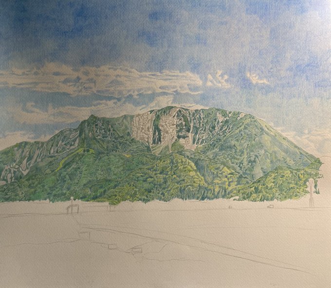 #水彩画 #透明水彩 #風景画 #Watercolor #landscapepainting #家路 現場スケッチを単色(Indigo)で描き直しました。 空気が澄んでいると #大山(正面) の左に富士山が見えます。