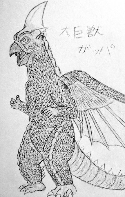 #大巨獣ガッパ55周年 #大巨獣ガッパ 怪獣を通して人間を見、人間を通して怪獣を見る。 そんな映画だと思います。 ↓タコもイカもバイラスも似たようなもんだろ全部美味しいよ!漫画。※このバイラスは単独外回りをしていた個体だと思ってください。#ファンアート