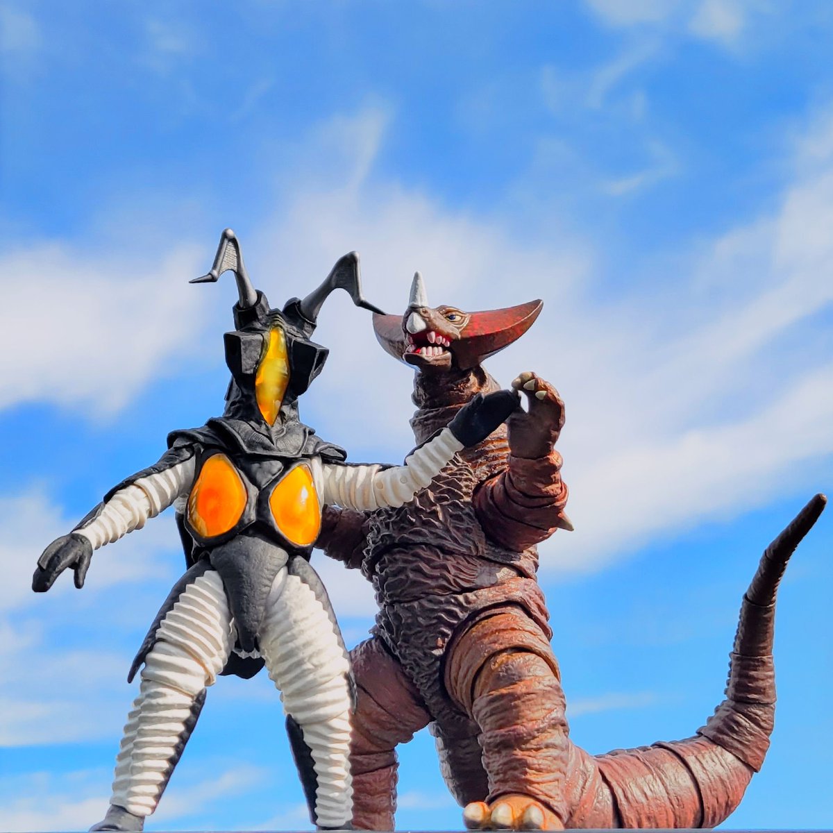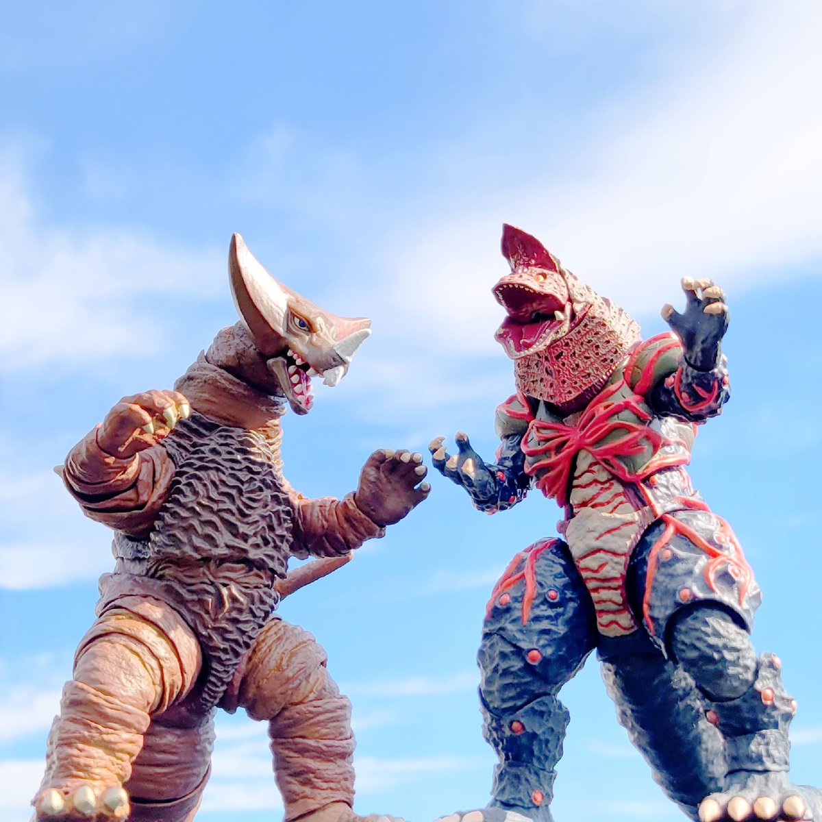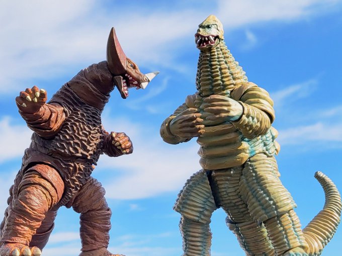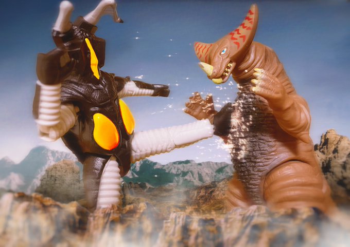 #夜のフィギュア撮影会 お題:古/懐 過去 ウルギャラ第2話で繰り広げられた古代怪獣ゴモラVS超古代怪獣ゴルザの対決。 当時見た時はゴルザが懐かしかった。 #ゴモラ #ゴルザ #ウルトラアーツ #大怪獣バトル #フィギュアーツ写真部 #ちいさな巨大特撮