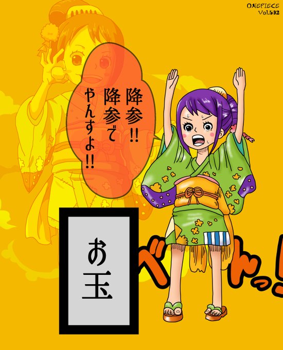 #イラスト #大枠全部描いてワンピ最終回を盛り上げたひ 『ONEPIECE:No.502/5000』 この時、ルフィはまだ知らない。お玉がかつて出会った『ある男』の正体を。それは、ルフィにとって極めて重要な、人物だった。