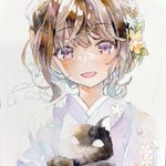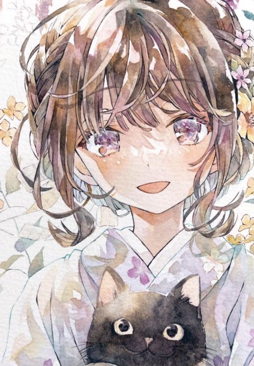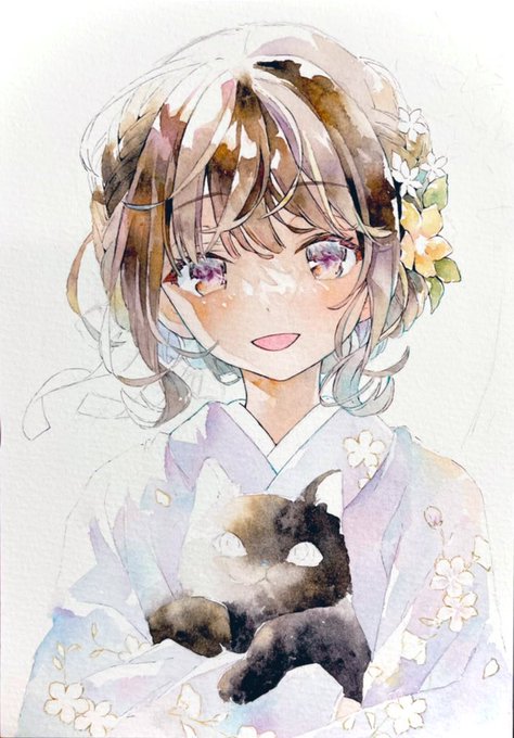 #大正着物鬼譚 発売記念に瑛子ちゃんと黒助を描きました! 着物大好きな瑛子、ぶみゃぶみゃと鳴く猫の黒助、無愛想で謎の多い冬馬が巻き込まれていく着物×謎解きミステリーをどうぞよろしくお願いいたします✨ #illustration #watercolour #透明水彩