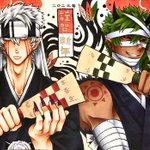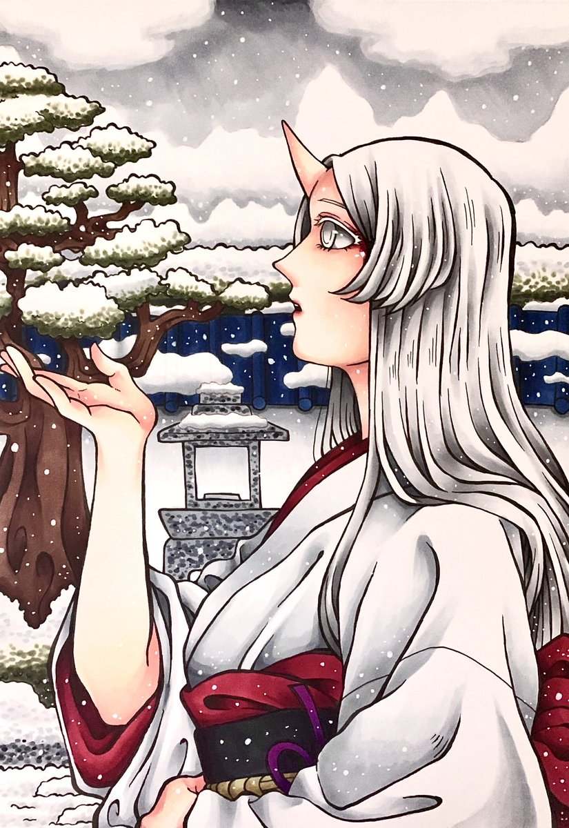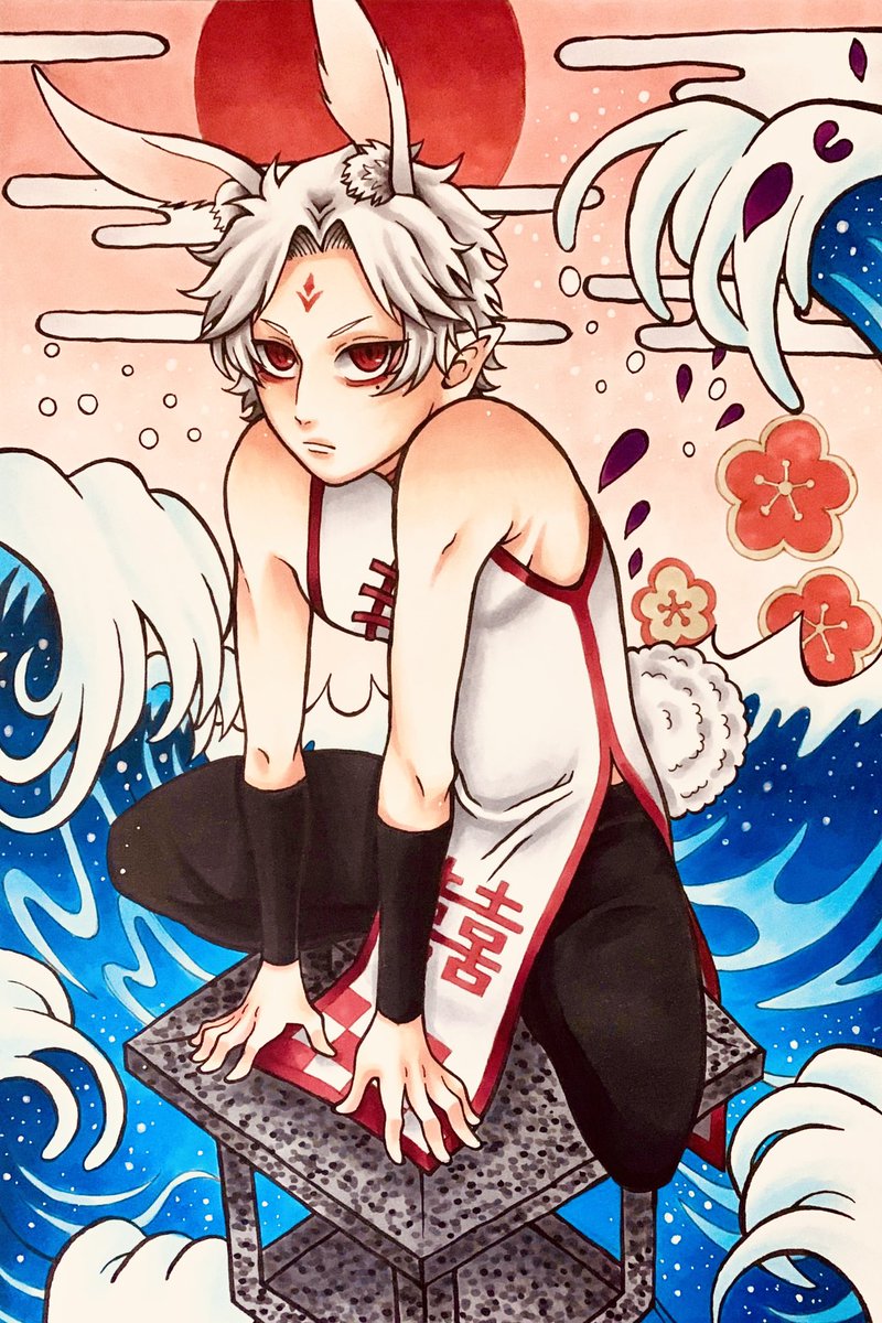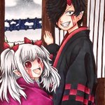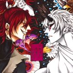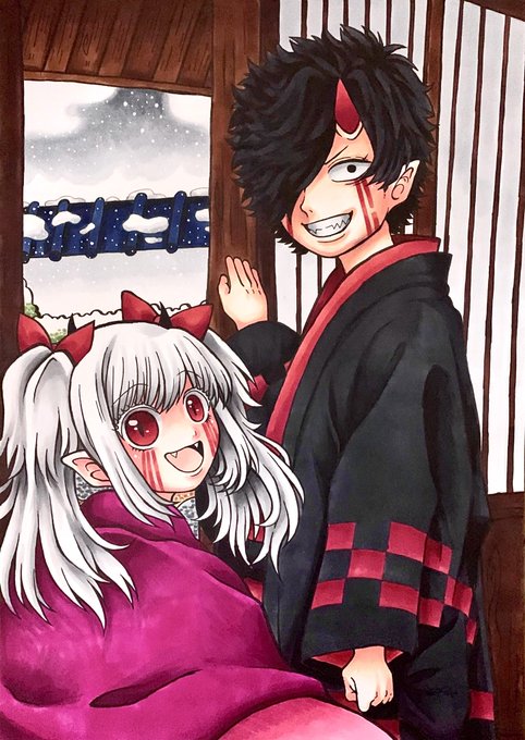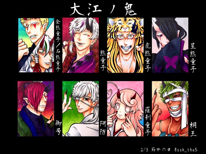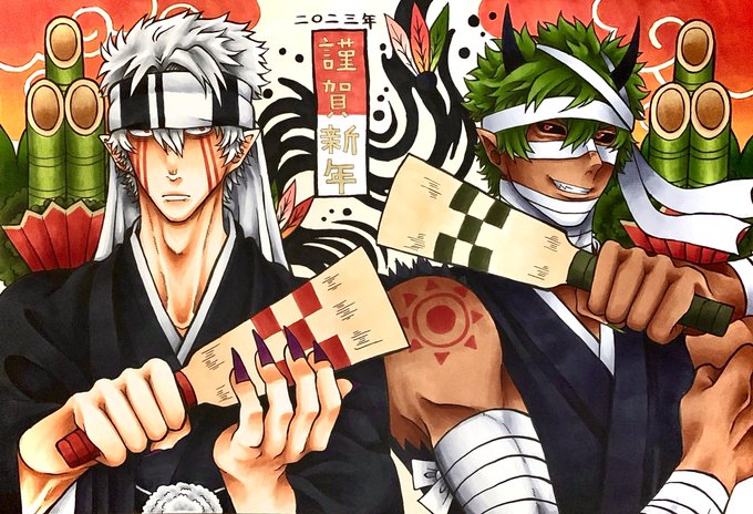 #自創作男子イラストフェス01 #大江ノ鬼 鬼童丸 (白い子) 真面目な青年で見た目怖いけど優しい子、不真面目な子は苦手 酒呑と茨木の息子で親殺しの復讐を過去に果たしている 桐王 (緑の子) 鬼童丸の戦友でパートナー存在 大江山の森林を支える木の妖怪 足技が得意で体から植物を生やすことができる