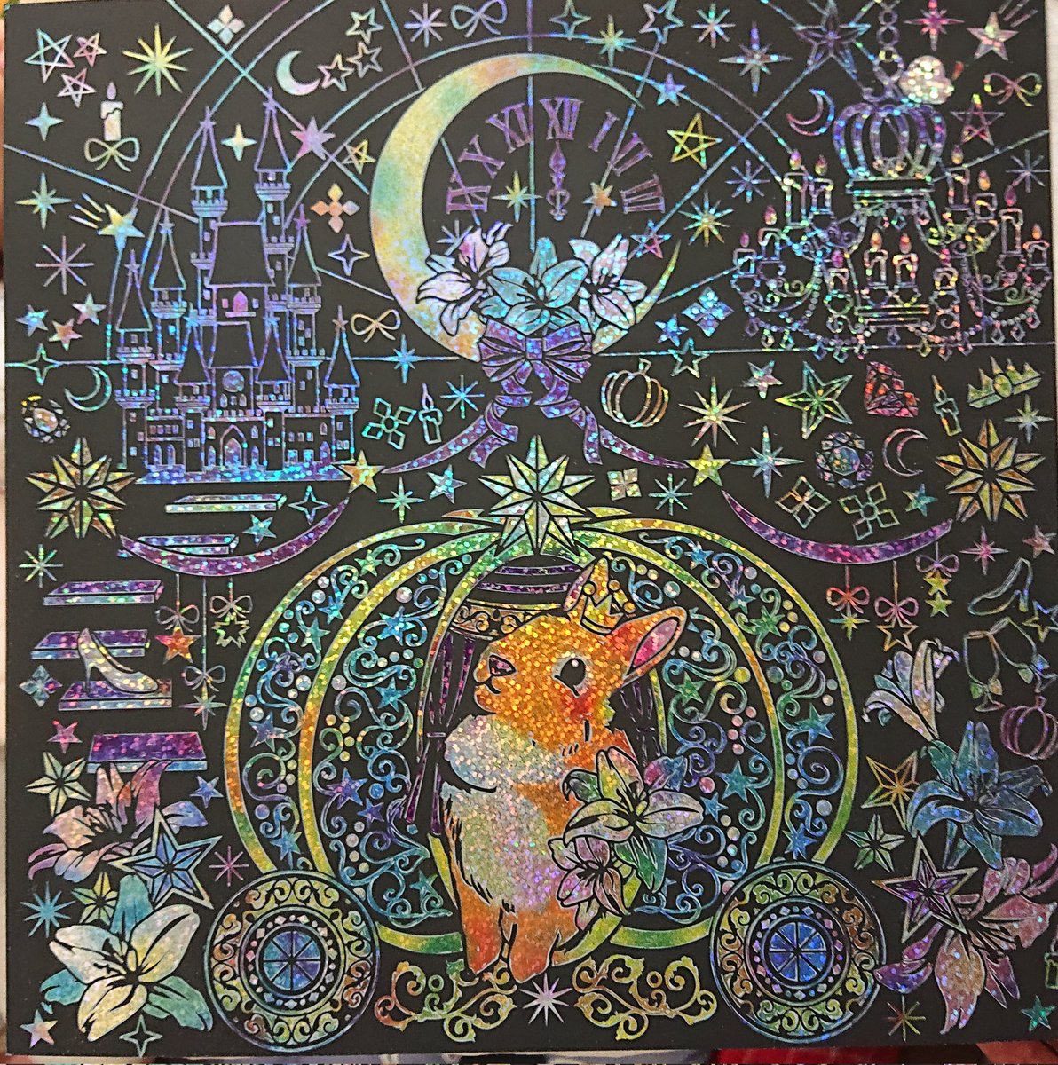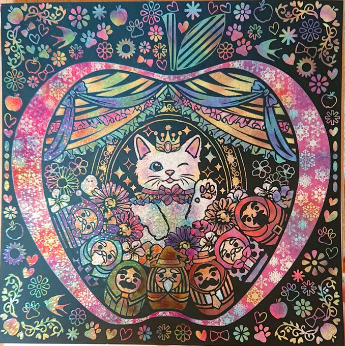 やっと土曜日~外は台風🍃🌀☔️ お楽しみで残しておいたニャンコとリンゴ すでに下絵は知ってるけど、やっぱり削るのワクワクする~o(*゚∀゚*)o #スクラッチアート #シマエナガinワンダーランド #大泉書店