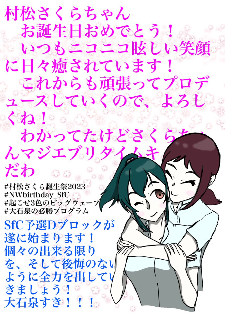さくらお誕生日おめでと〜!🌸🎉 わかってたけどさくらちゃんマジエブリタイムキュートだわ そして始まるDブロックは、我らが大石泉すき! #村松さくら誕生祭2023 #村松さくら生誕祭2023 #NWbirthday_SfC #起こせ3色のビッグウェーブ #大石泉の必勝プログラム #大石泉とみんなで作るグループDの奇跡