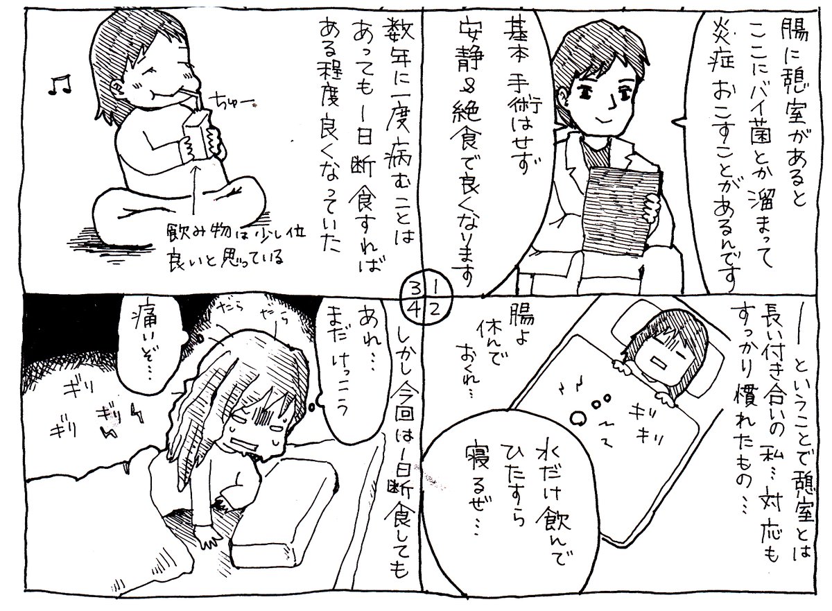 大腸憩室炎で3日間断食した話⑨ 翌朝夫に「腹減ってたならゼリー飲めばよかったのに」って言われた。そうですよね。 寝たきりだったときアナログで描いたレポ漫画。 10まで毎日更新。 #漫画が読めるハッシュタグ #コルクラボマンガ専科 #アスの毎日絵日記 #大腸憩室炎