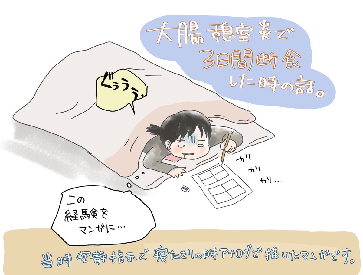 大腸憩室炎で3日間断食した話⑦ リプ20件超心配してくださった方に感謝! 点滴時の無の時間、結構良かったな。 寝たきりだったときアナログで描いたレポ漫画。 10まで毎日21時更新。 #漫画が読めるハッシュタグ #コルクラボマンガ専科 #アスの毎日絵日記 #大腸憩室炎